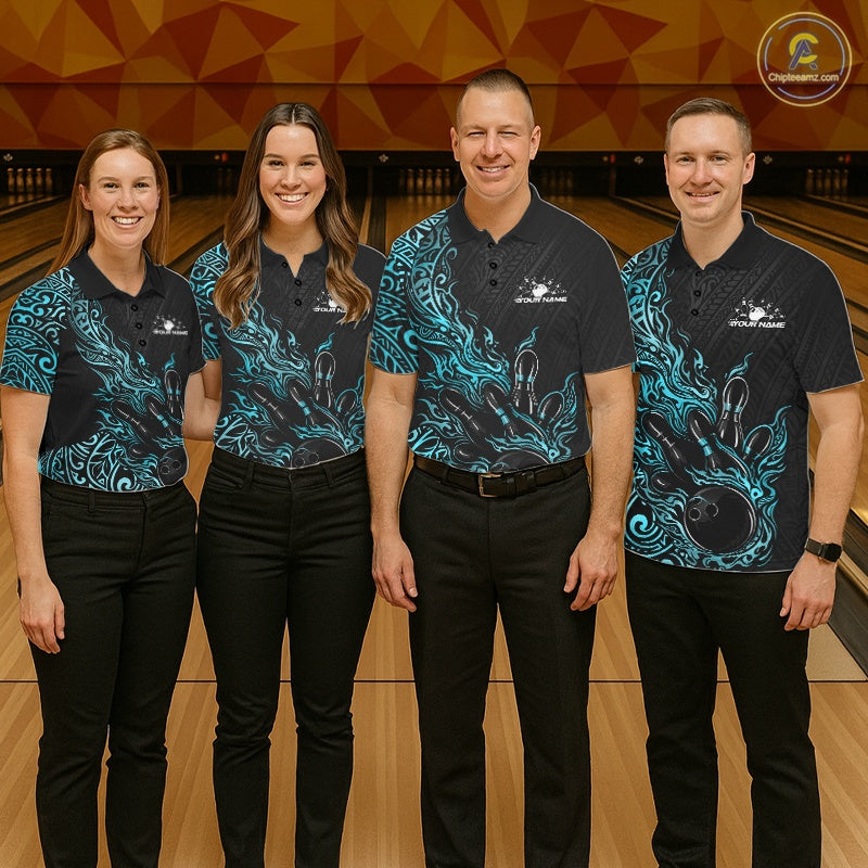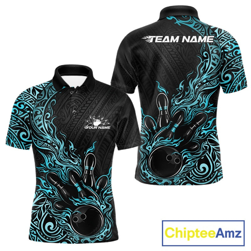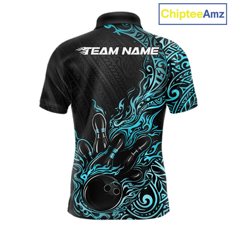 Custom Black And Blue Tribal Flame Bowling Ball Bowling Team Shirts, Polynesian Bowling Tournament Shirt IPHW10502