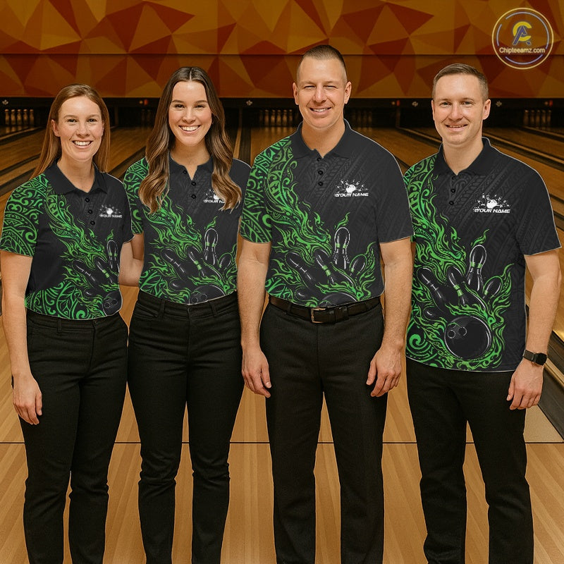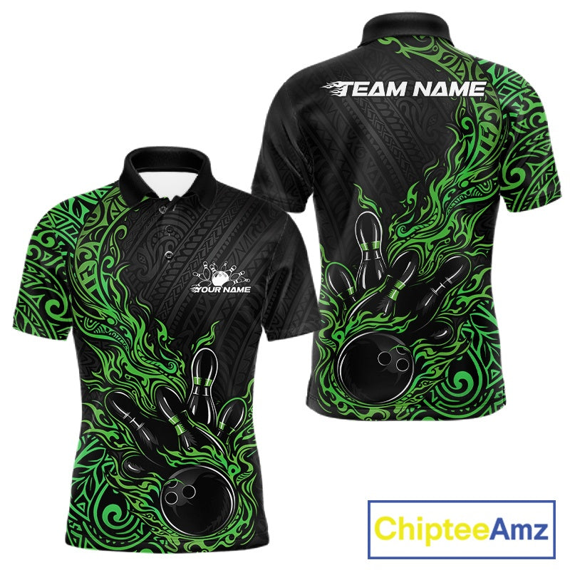 Custom Black And Green Tribal Flame Bowling Ball Bowling Team Shirts, Polynesian Bowling Tournament Shirt IPHW10504