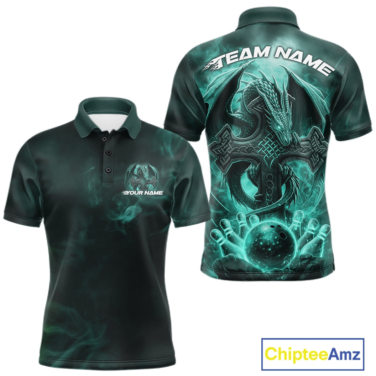 Custom Turquoise Blue Flame Celtic Cross Dragon Bowling Team Shirts, Faith Bowling Tournament Shirts IPHW10509