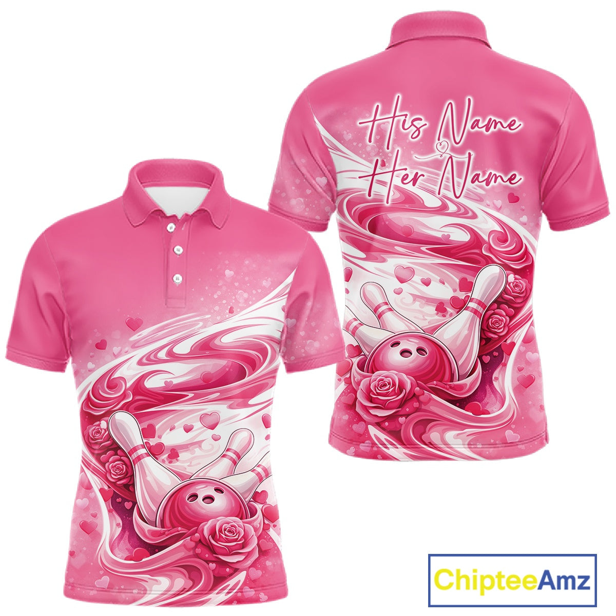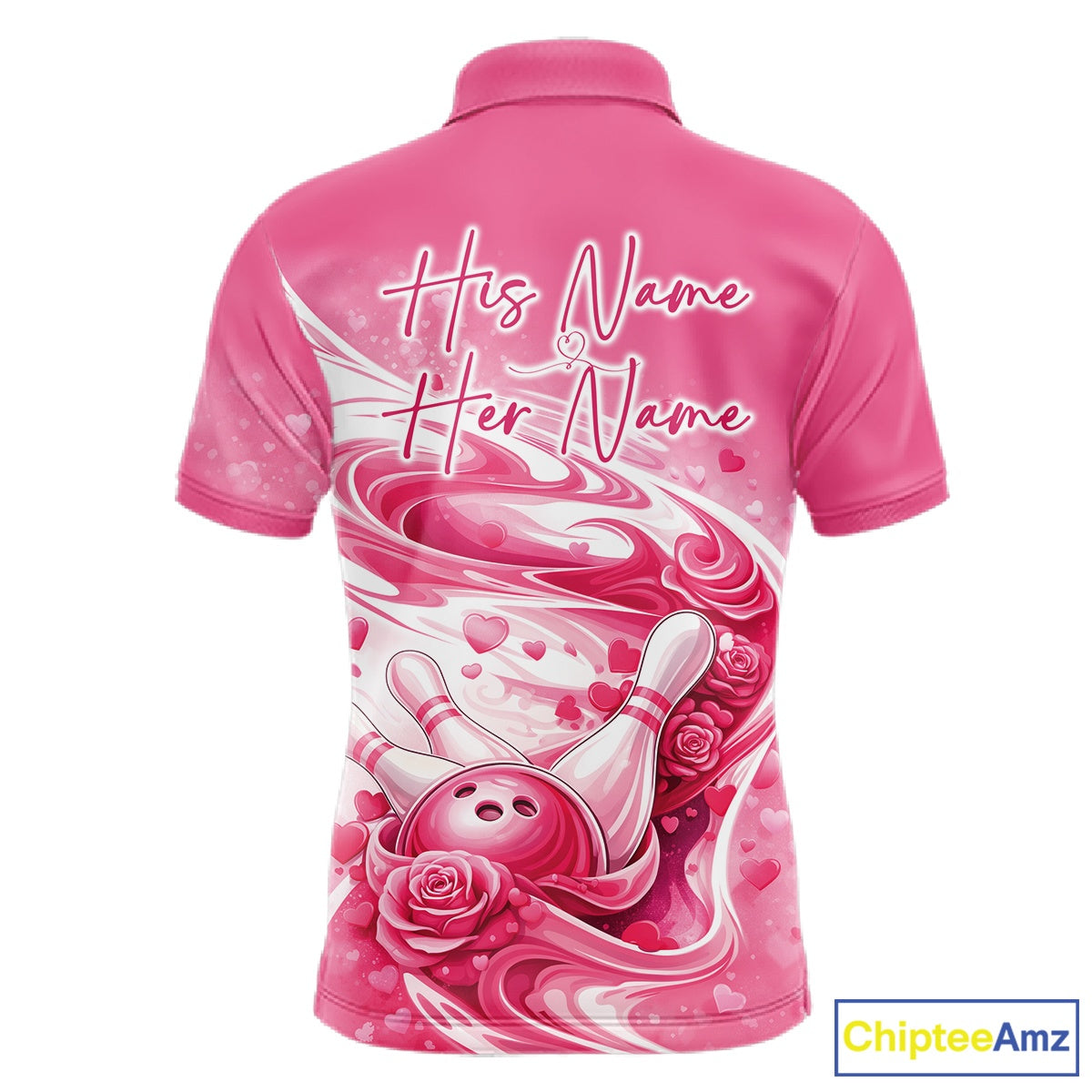 Custom Pink Heart Valentine Bowling Couples Shirt, Heart And Roses Bowling Husband And Wife Gifts With Name IPHW10518