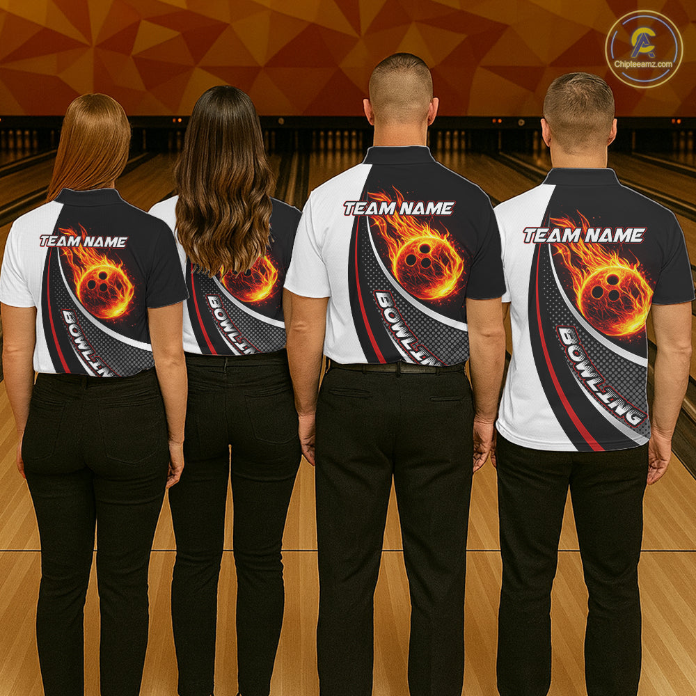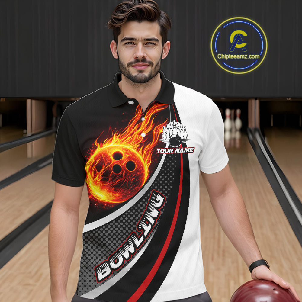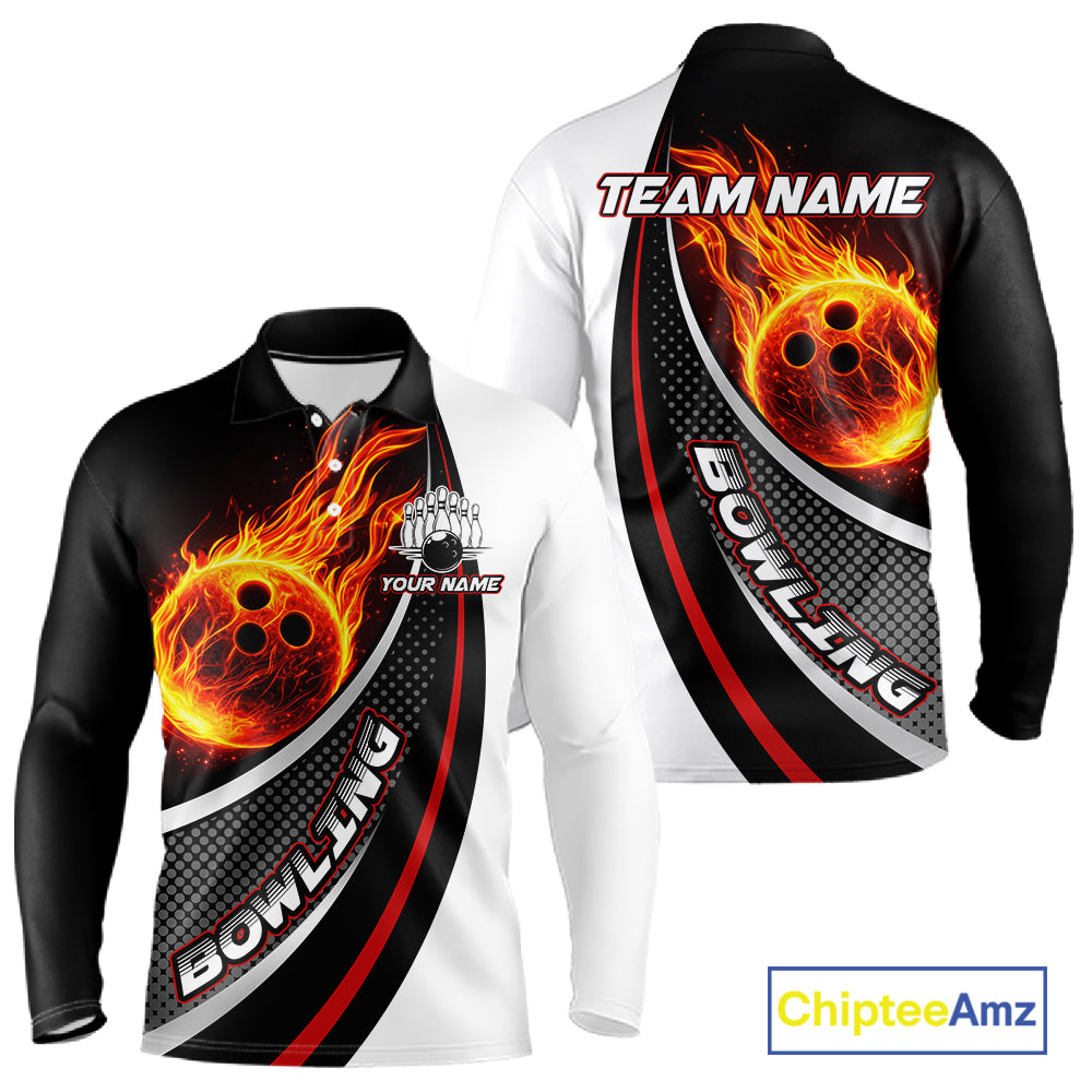 Personalized Black & White Red Flame Bowling Polo, 1/4 zip Team Shirts For Men, Gifts For Bowlers NQS11358