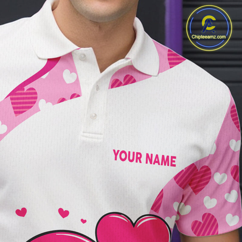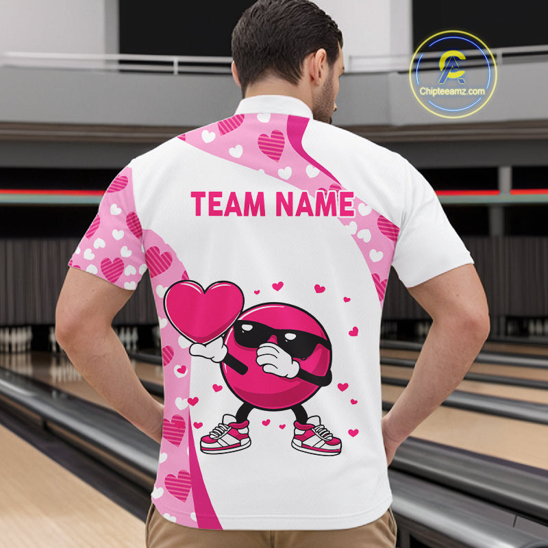 Personalized funny bowling ball pink heart pattern white Mens bowling shirts, Valentine bowling gifts NQS11325