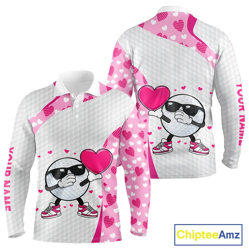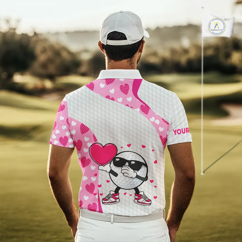 Personalized funny golf ball pink heart pattern white Mens golf polo shirts, Valentine golf gifts NQS11324