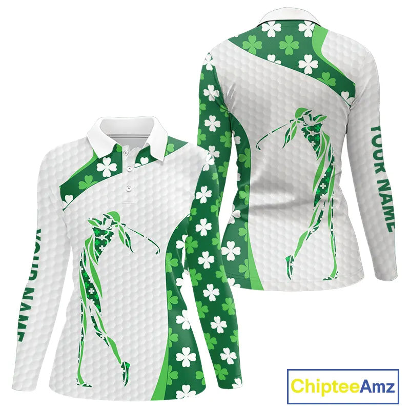 Personalized Green shamrock pattern golf white Women golf polo shirt custom St Patrick Day golf gift NQS11260
