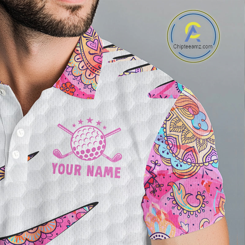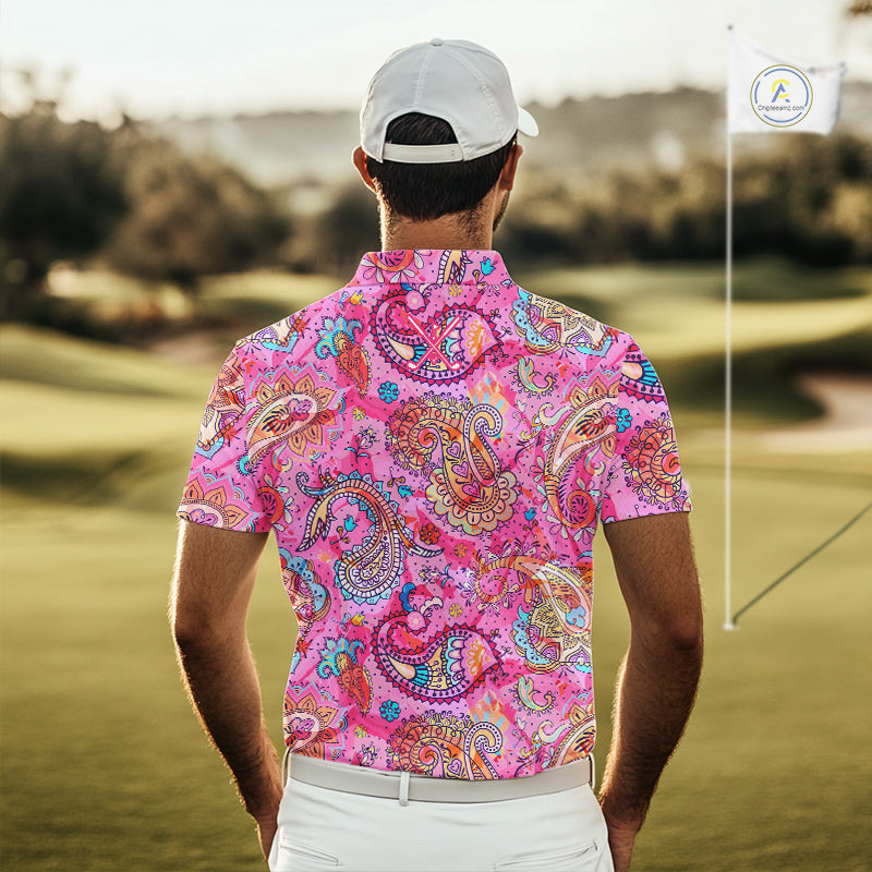 Pink Paisley Pattern Mens Golf Polo Shirt Custom Tropical Golf Attire For Men, Golf Gifts NHN0149