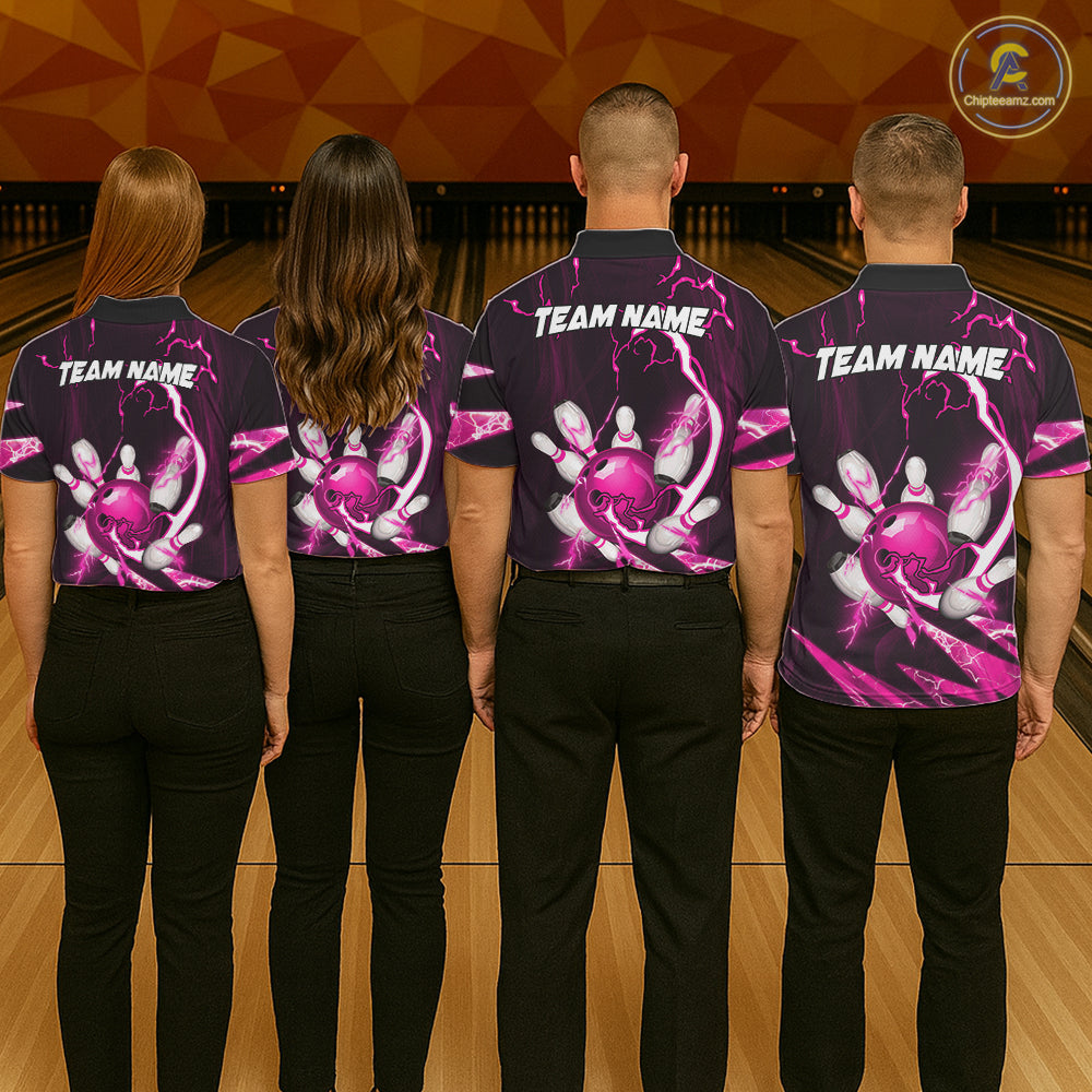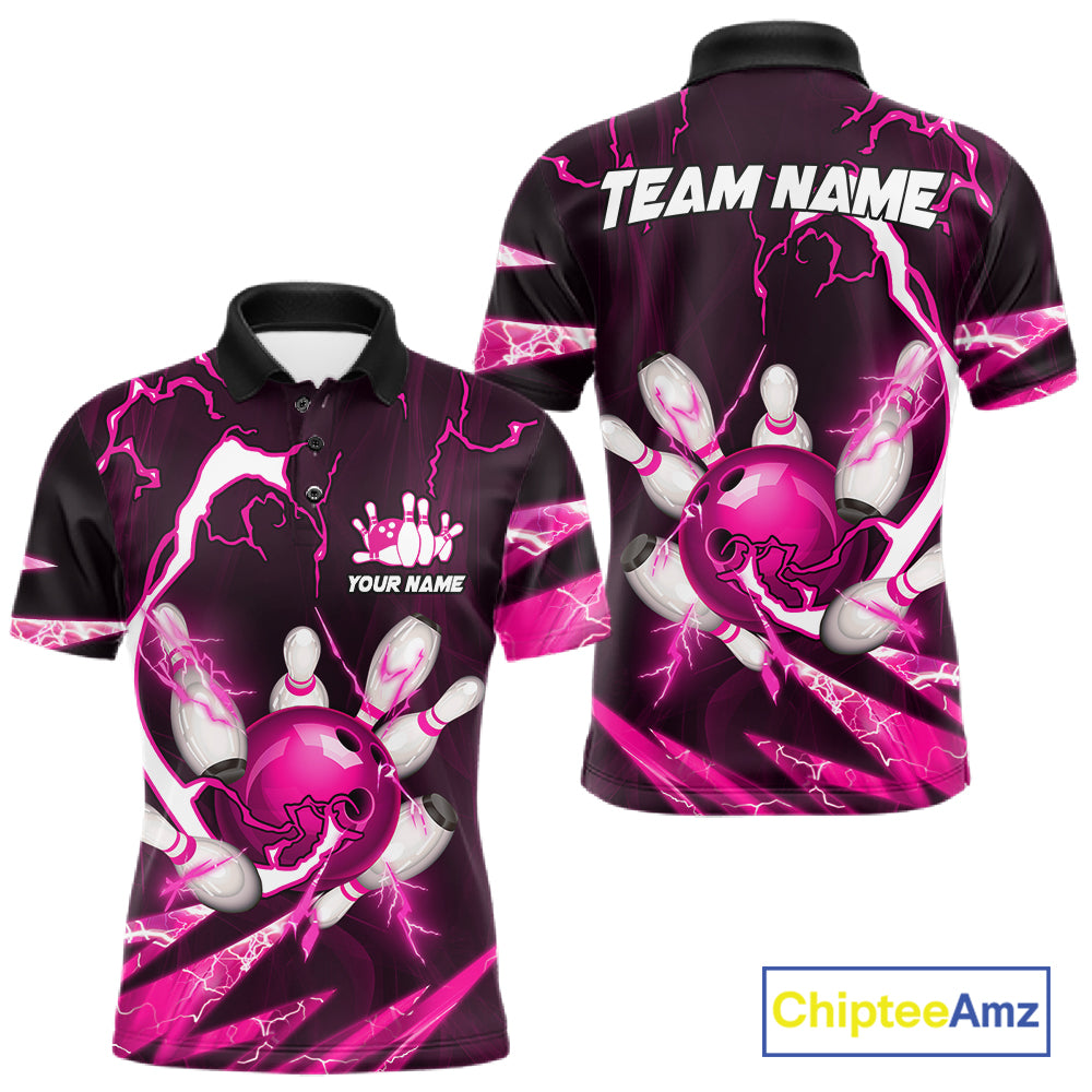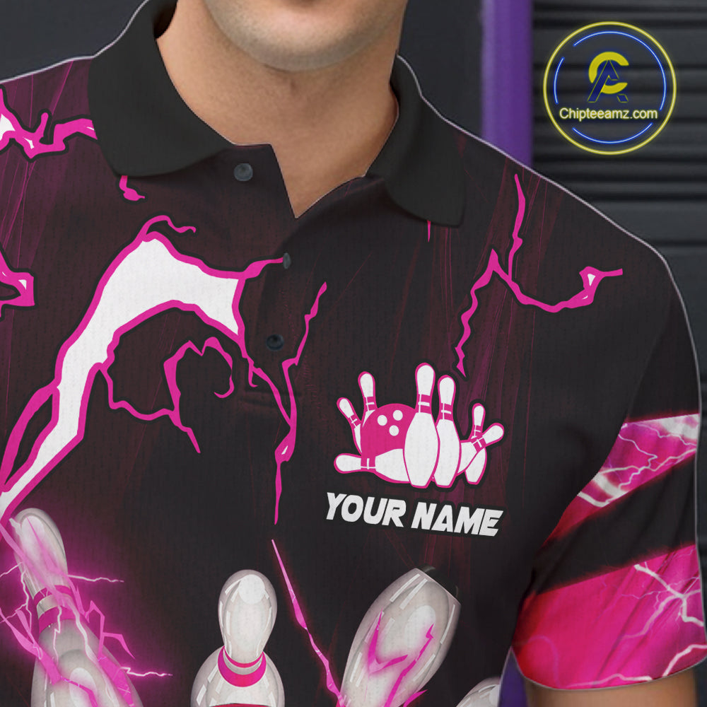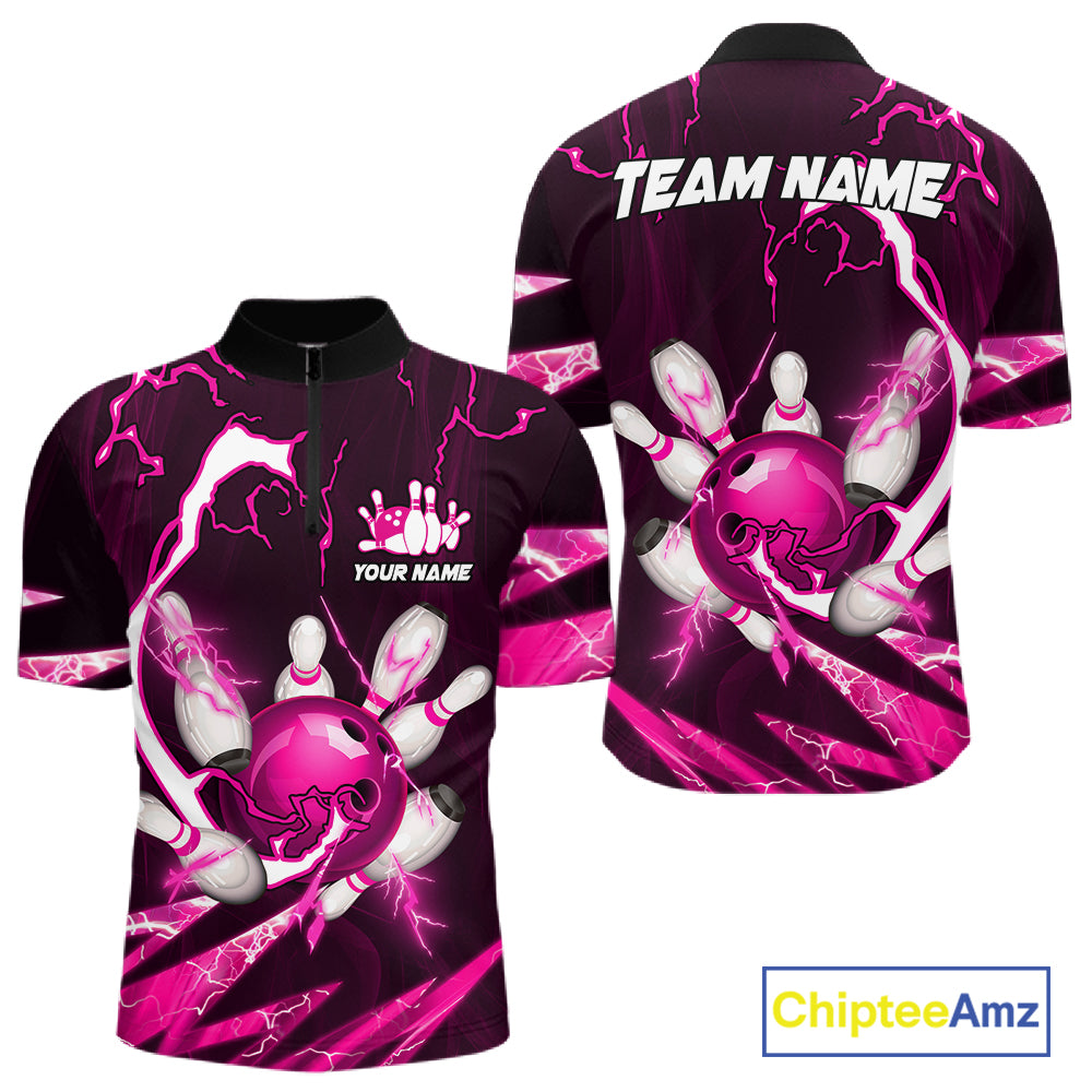 Pink Thunder Lightning bowling ball and pins jerseys Custom Team Bowling Polo, 1/4 Zip Shirts For Men NQS11283