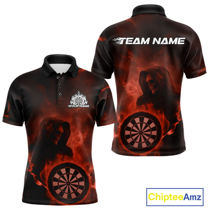 Custom Orange Flame Grim Reaper Skull Dart Men Polo Shirts, Halloween Dart Team Outfits IPHW10024