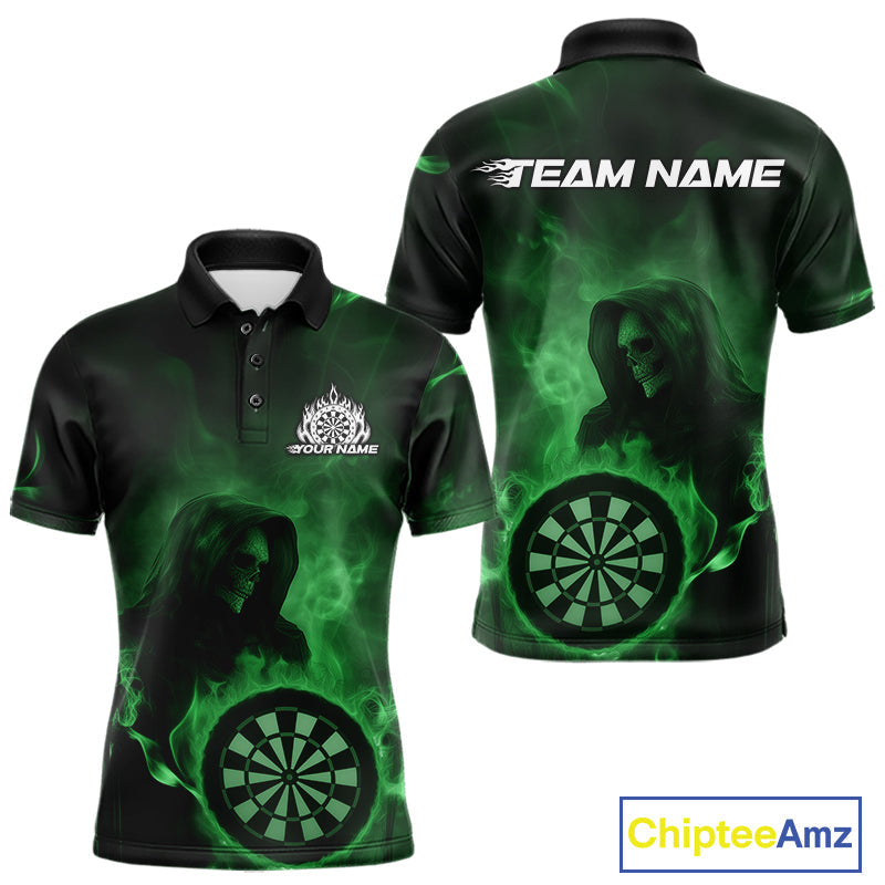 Custom Green Flame Grim Reaper Skull Dart Men Polo Shirts, Halloween Dart Team Outfits IPHW10025