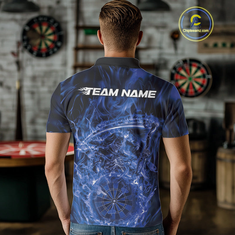 Custom Black And Blue Flame Grim Reaper Dart Team Men Polo Shirts, Halloween Otufit IPHW10036