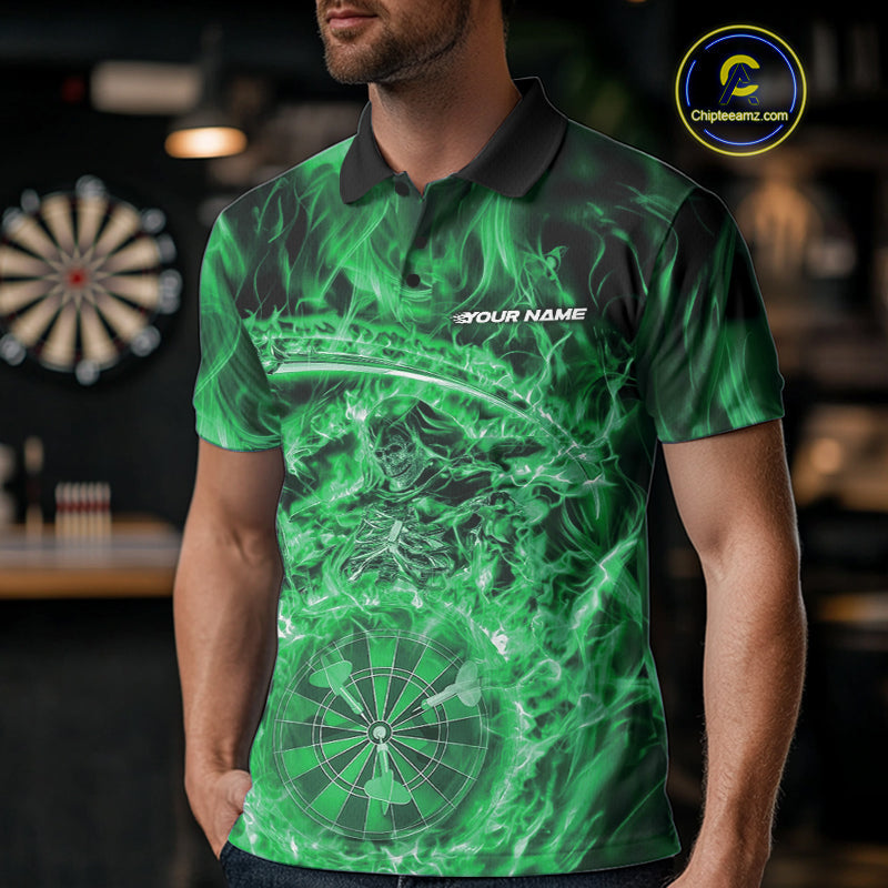 Custom Black And Green Flame Grim Reaper Dart Team Men Polo Shirts, Halloween Otufit IPHW10038