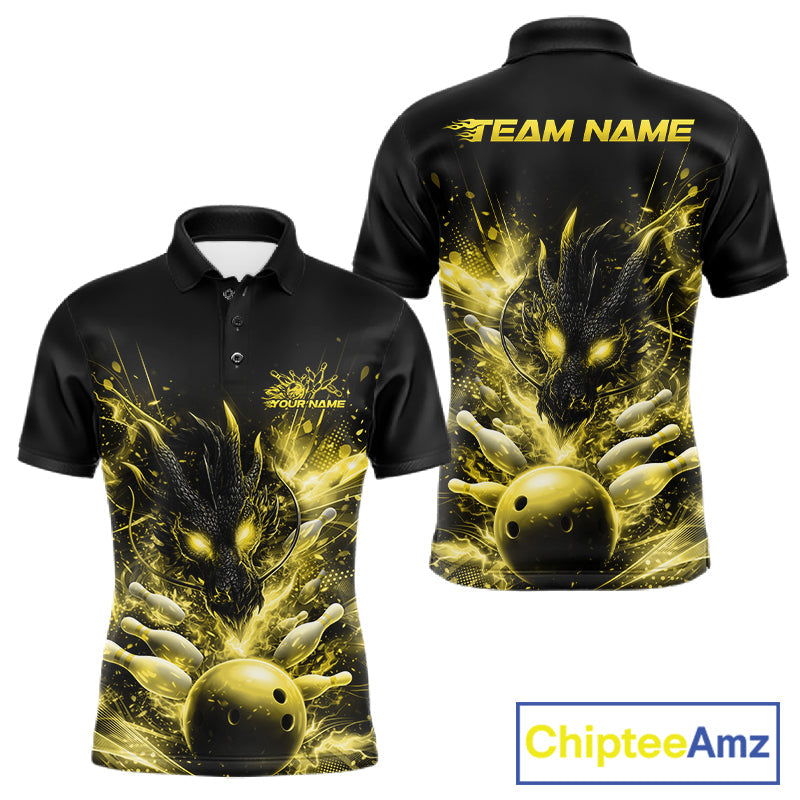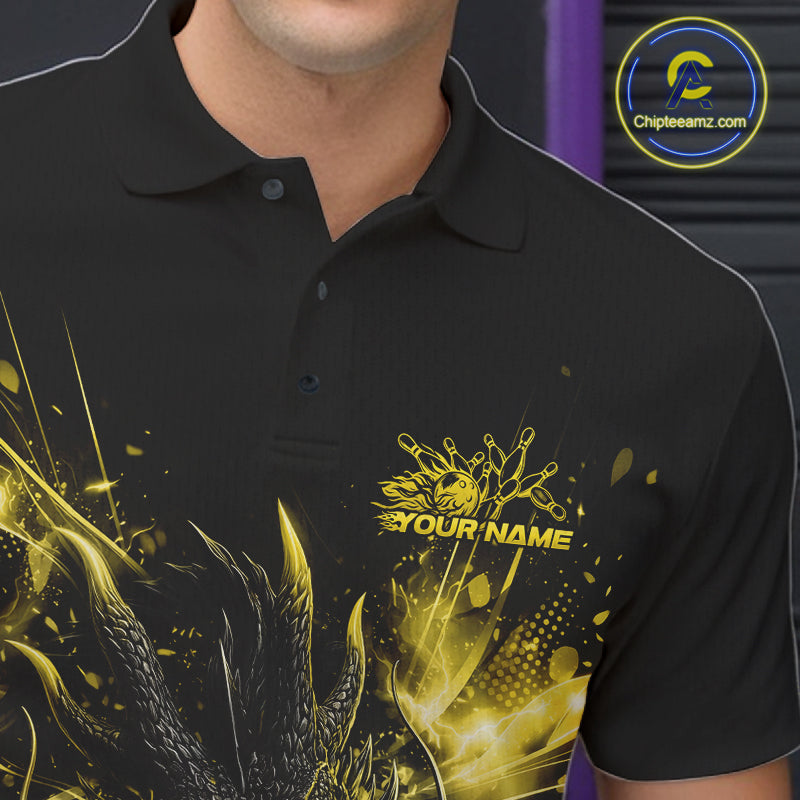 Custom Yellow Fire Flame Dragon Bowling Jerseys. Dragon Bowling Men Polo Shirt IPHW10283