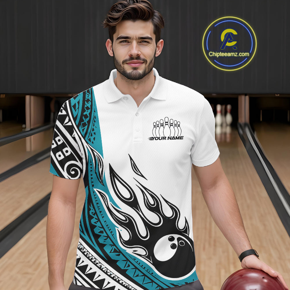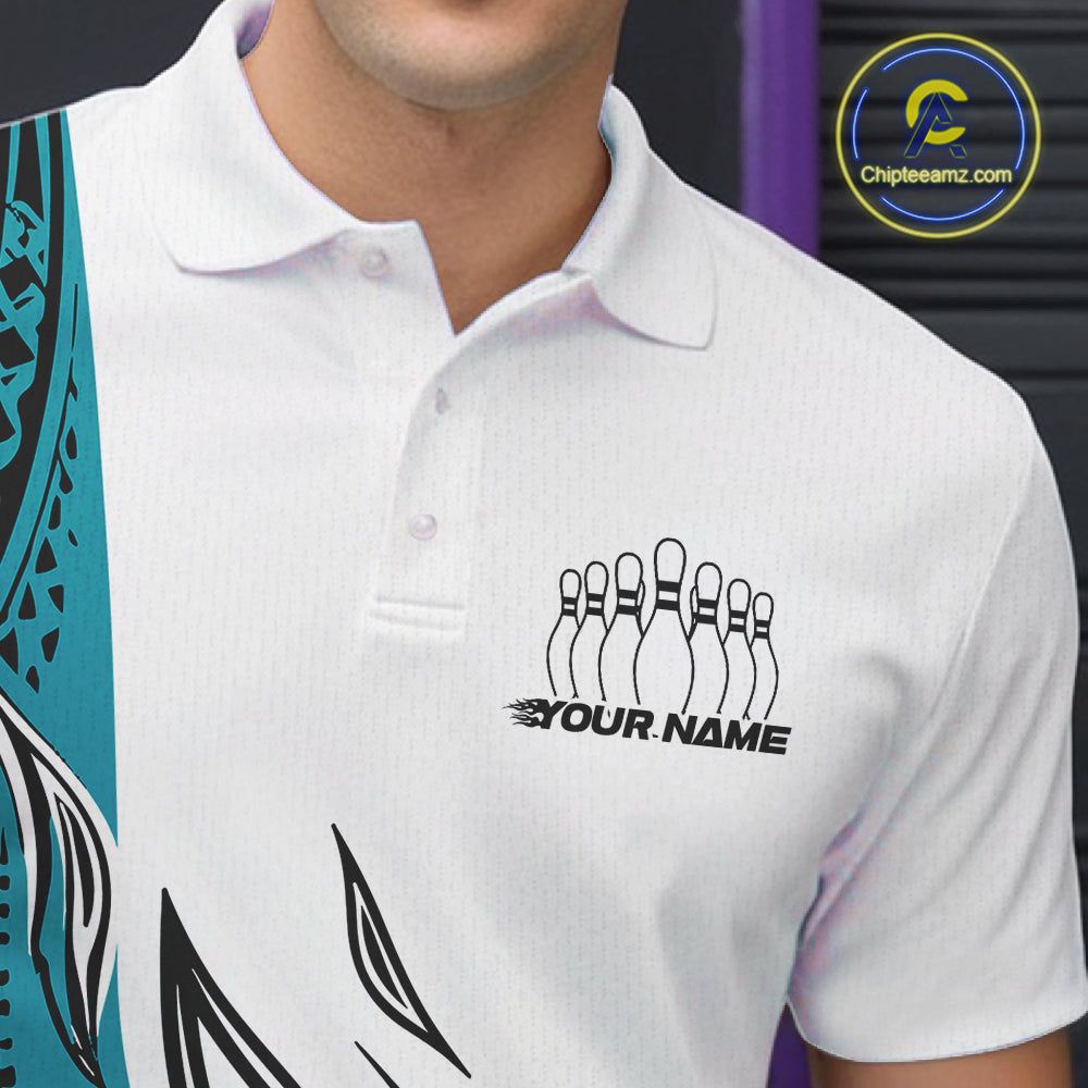 Custom Blue Tribal Polynesian Pattern Men Bowling Team Shirt, Maori Style Bowling Outfit IPHW10327
