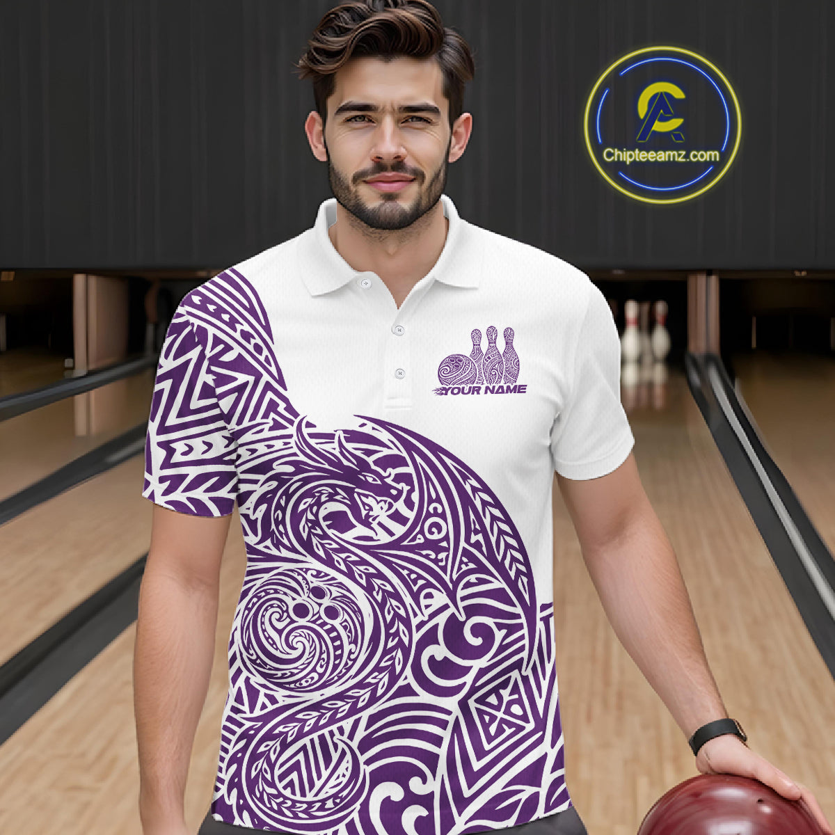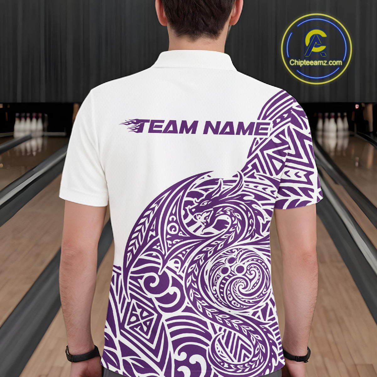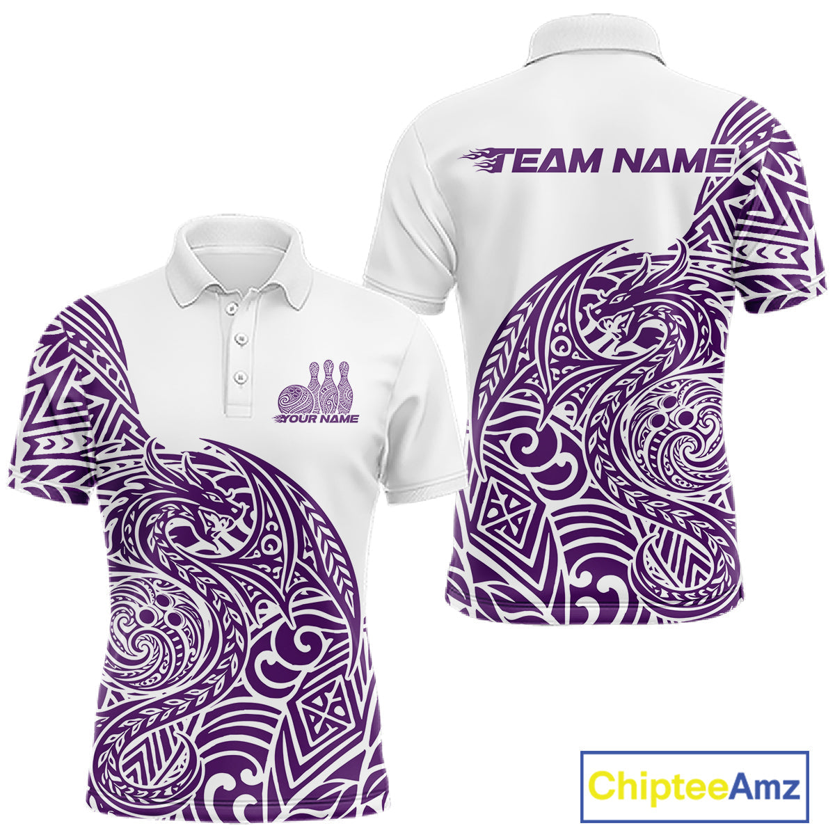 Custom Purple And White Tribal Dragon Men Bowling Polo Shirt, Polynesian Bowling Shirt IPHW10343