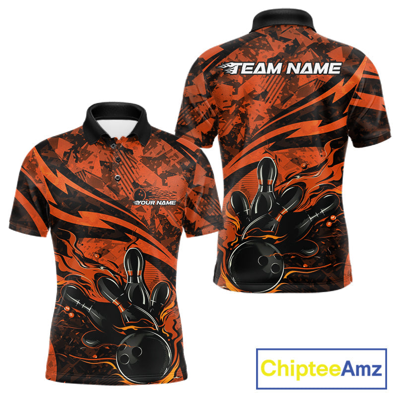 Custom Orange Camo Flame Bowling Men Polo Shirts, Camouflage Bowling Team Jerseys IPHW10347