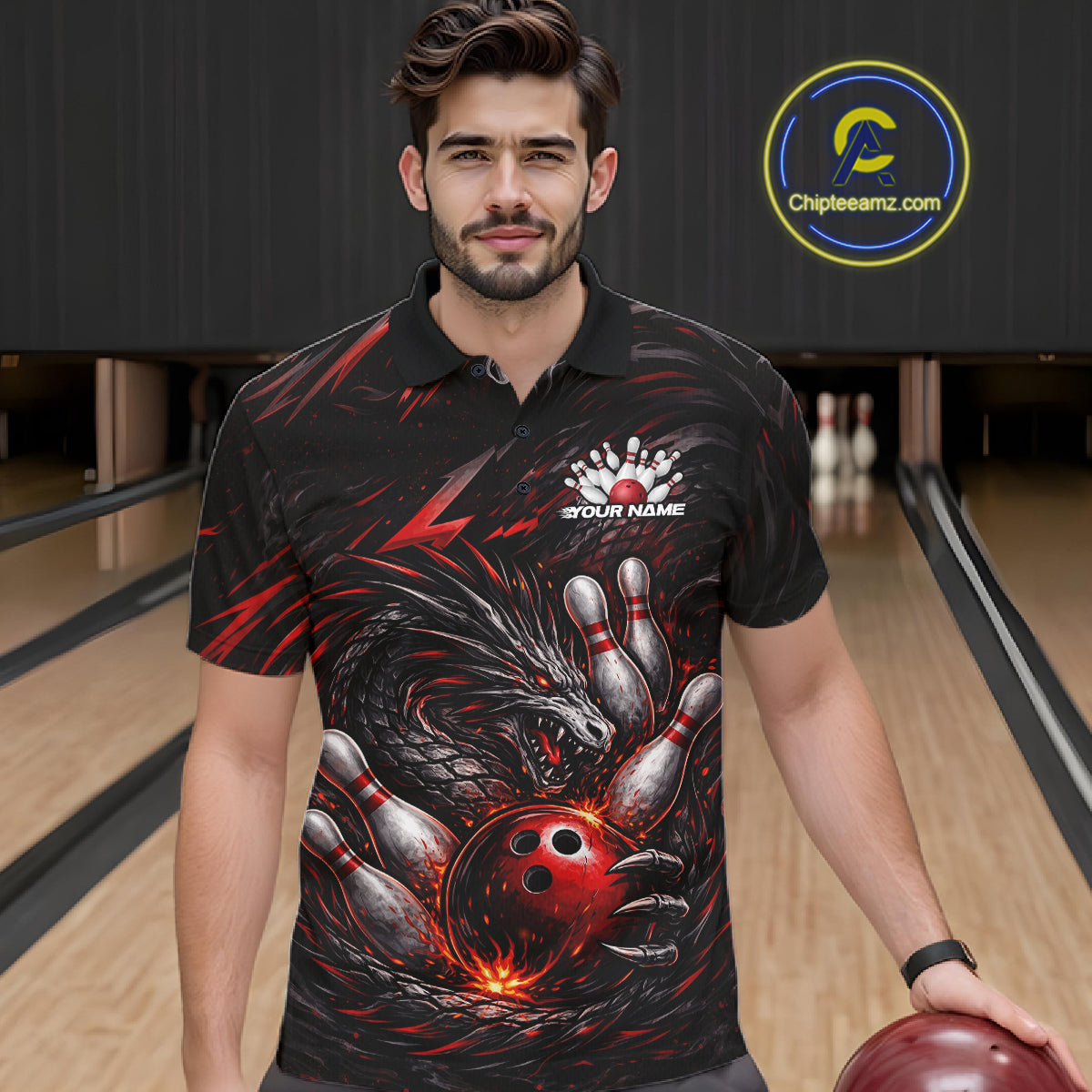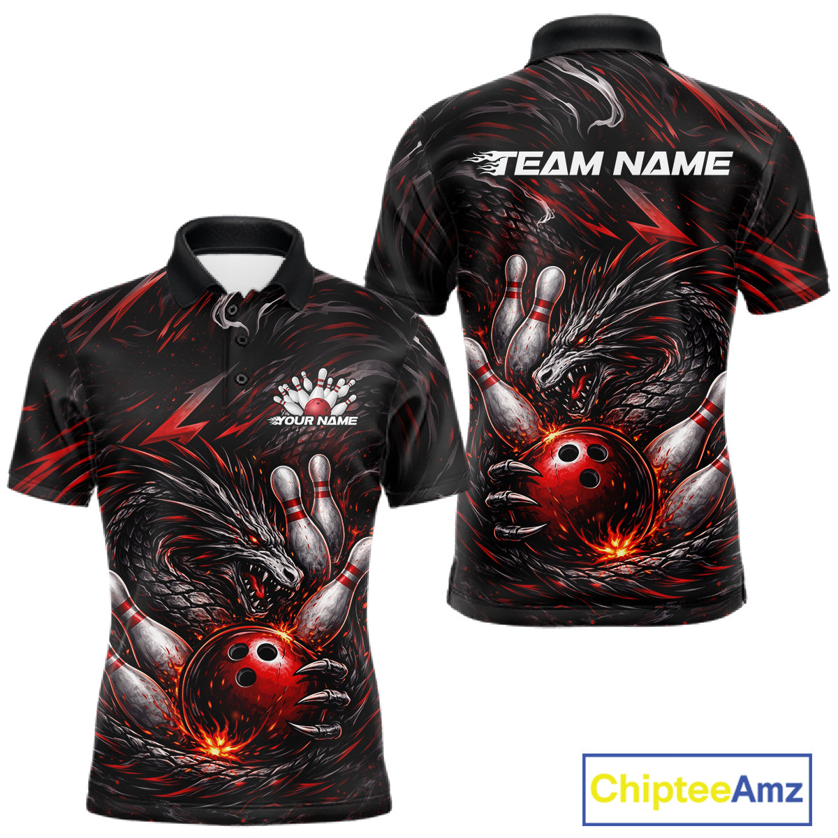 Custom Black And Red Dragon Bowling Jerseys, Dragon Bowling Team Men Polo Shirt IPHW10362