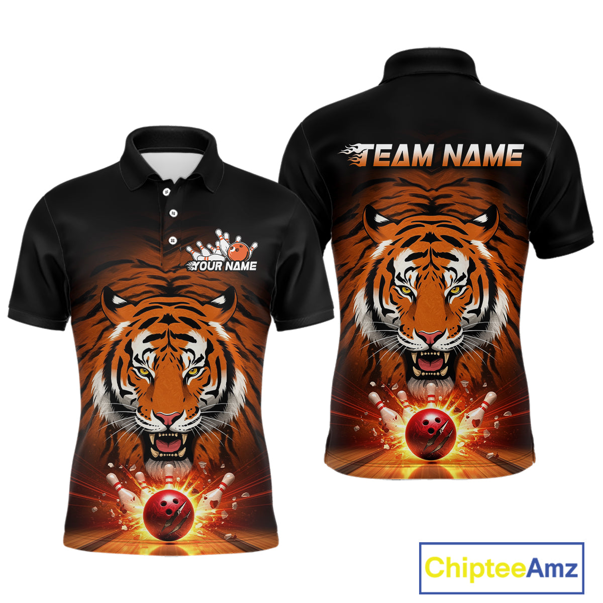 Custom Team Name Tiger Print Bowling Polo Shirts For Men, Bowling Team Tournament Outfit IPHW9092