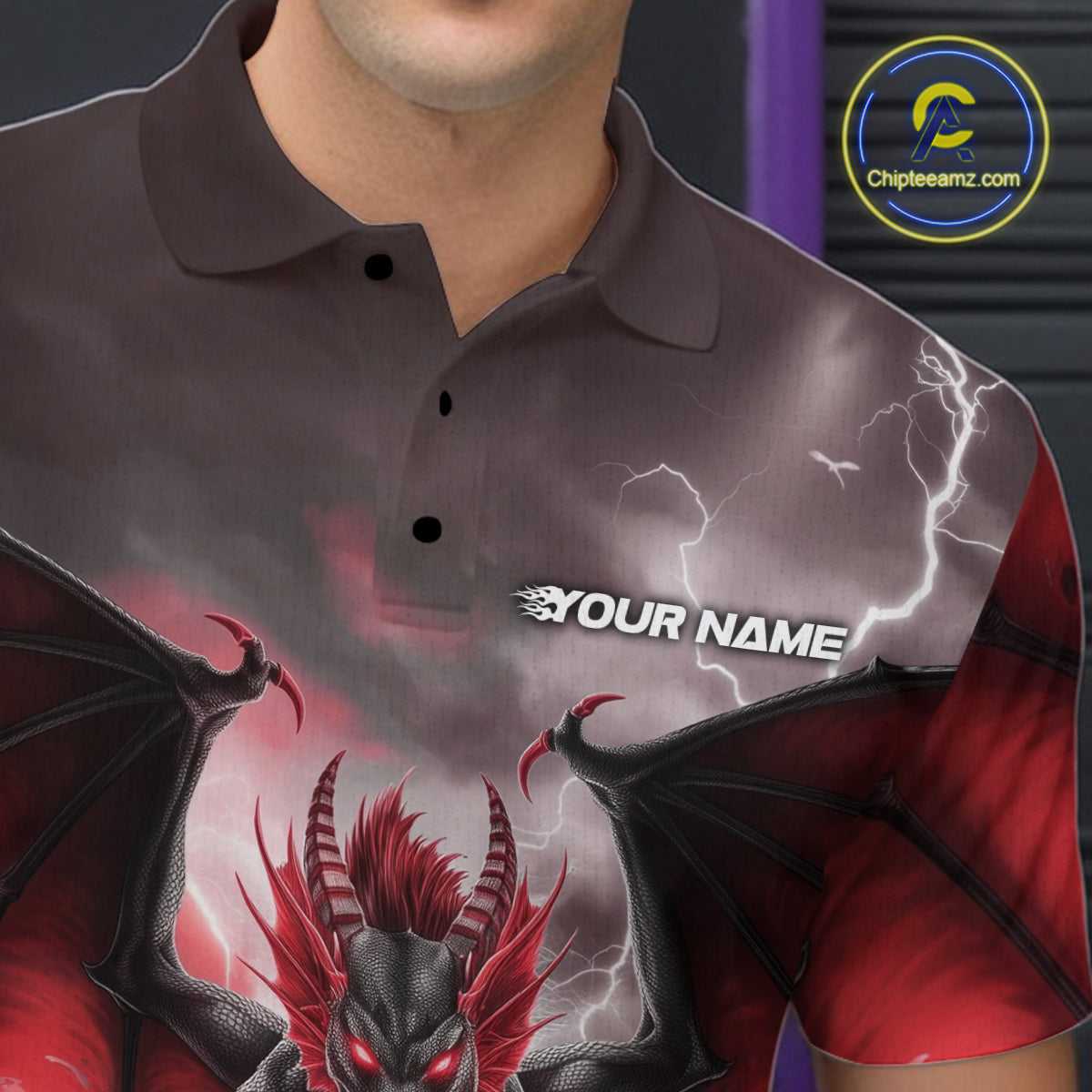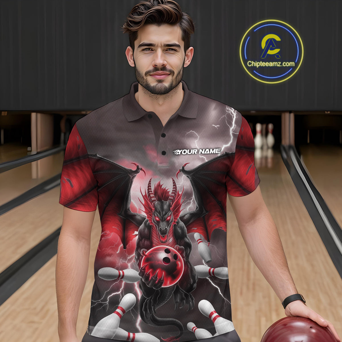 Custom Red Thunder Lightning Dragon Bowling Polo Shirts For Men, Team Uniform IPHW9103
