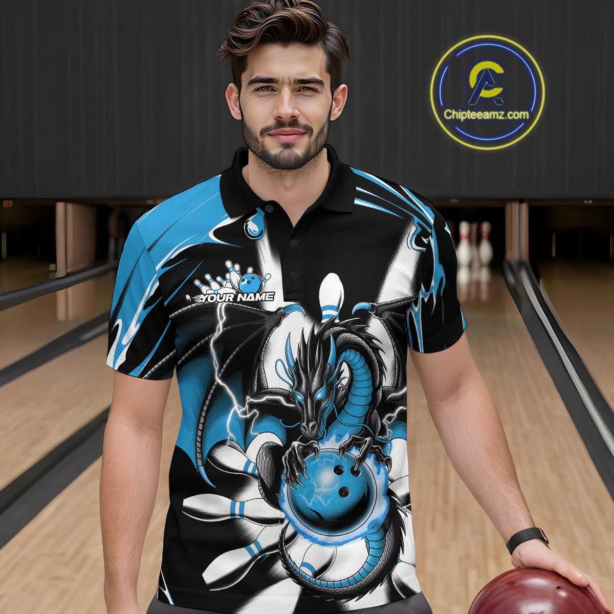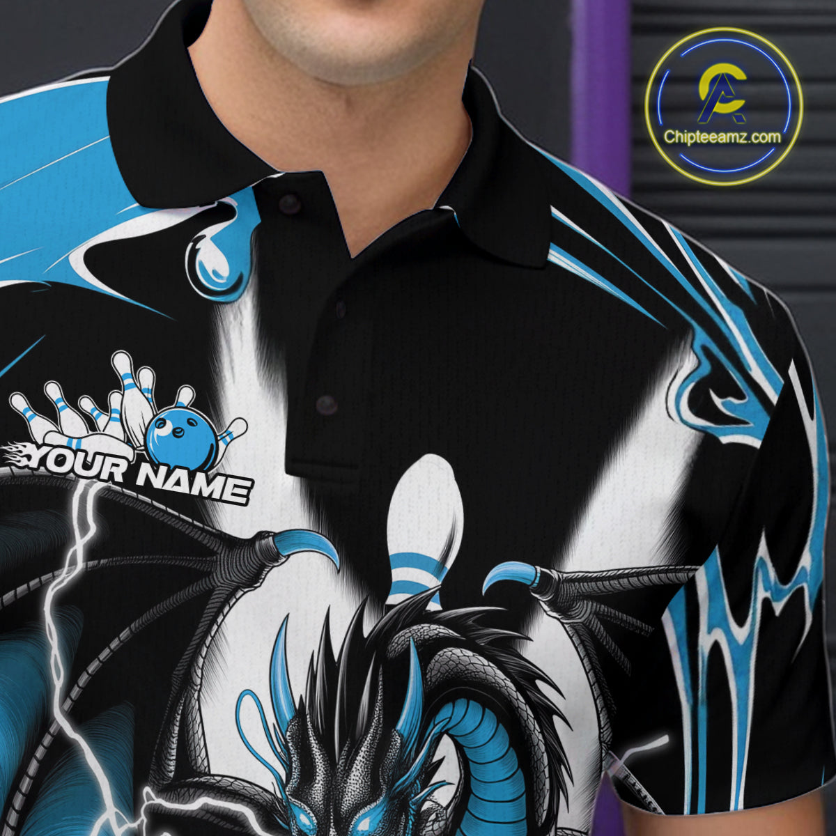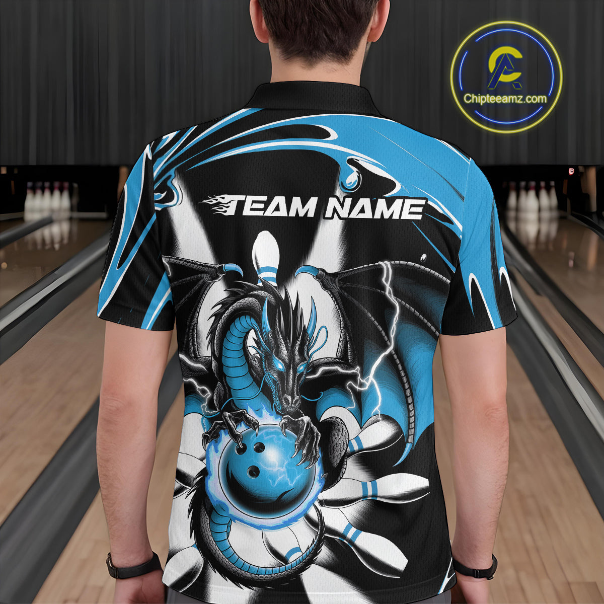 Custom Black And Blue Dragon Bowling Men Polo Shirts, Dragon Bowling Team Jerseys IPHW9109