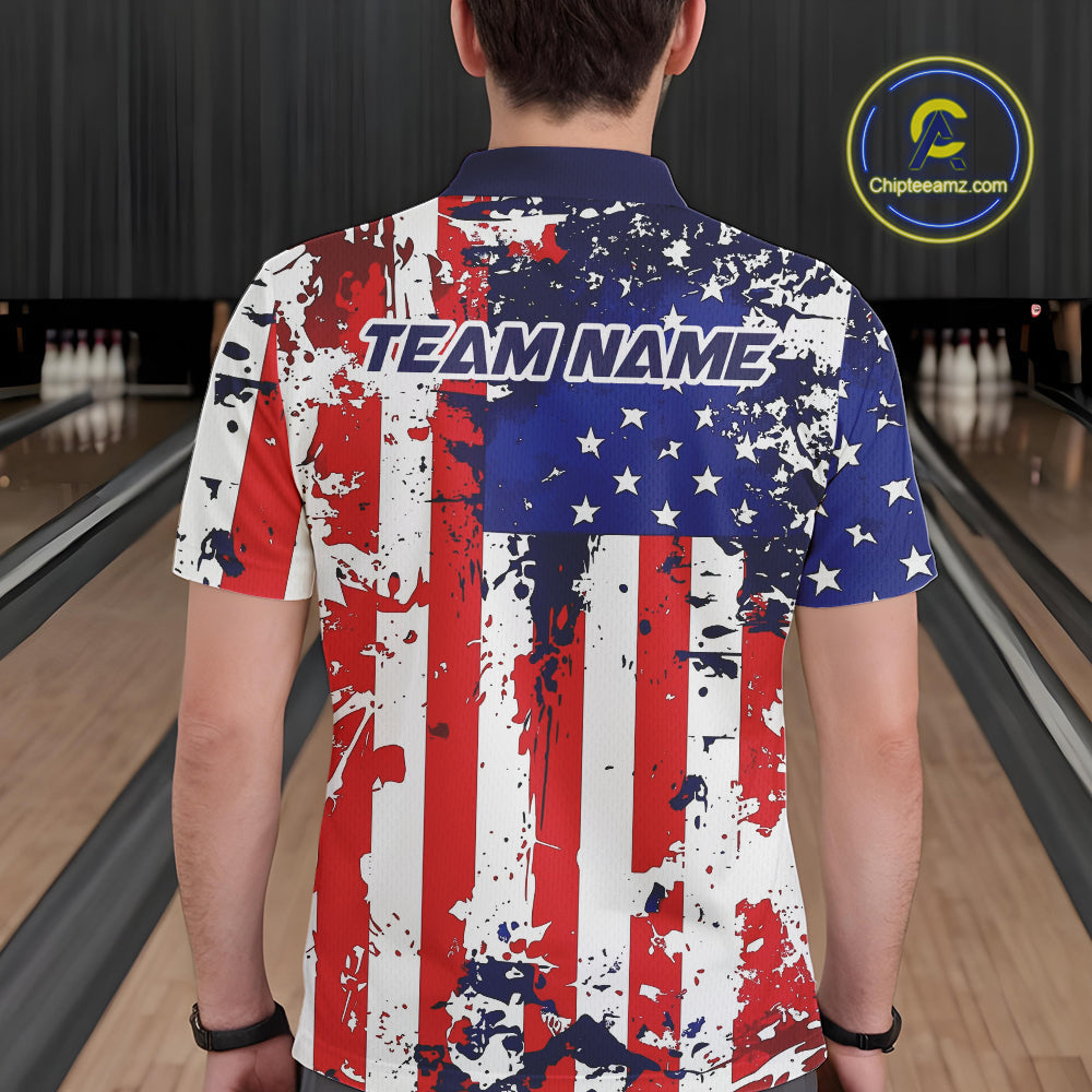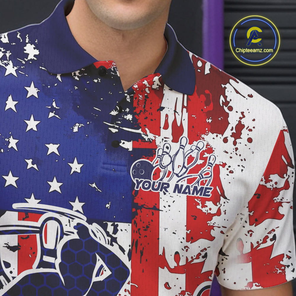 Custom Grunge US Flag Patriotic Bowling Polo Shirts For Men, US Bowling League Shirt IPHW9258