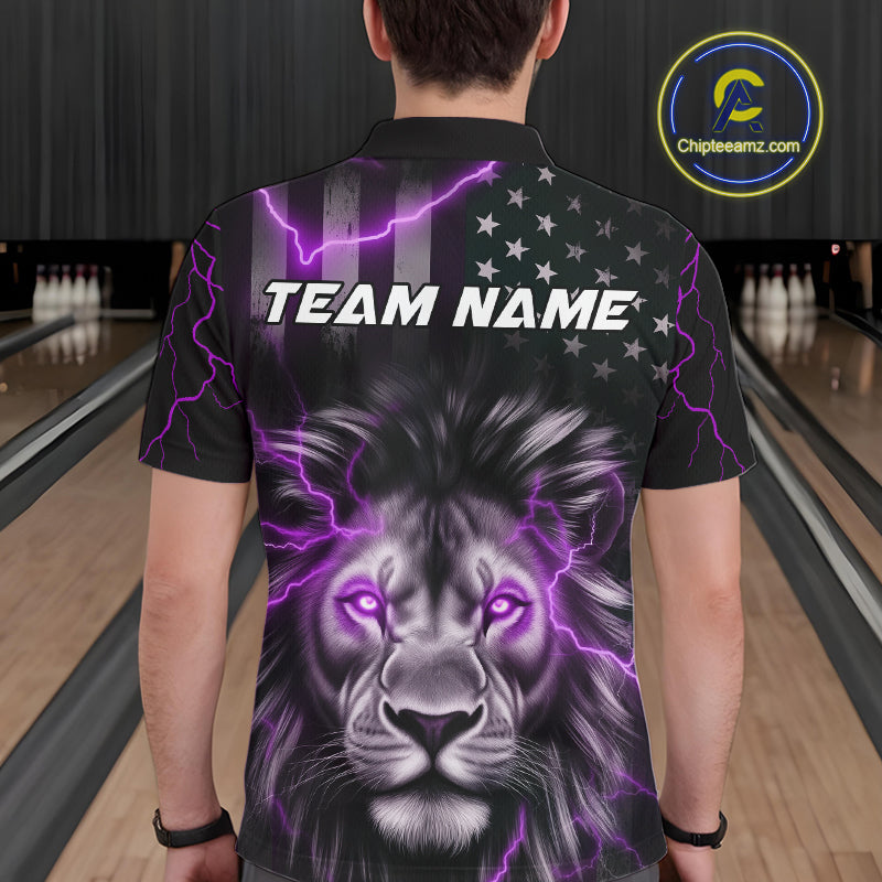 Custom Purple Thunder Lightning Patriotic Lion Polo Shirts For Men, US Flag Bowling Jerseys IPHW9324