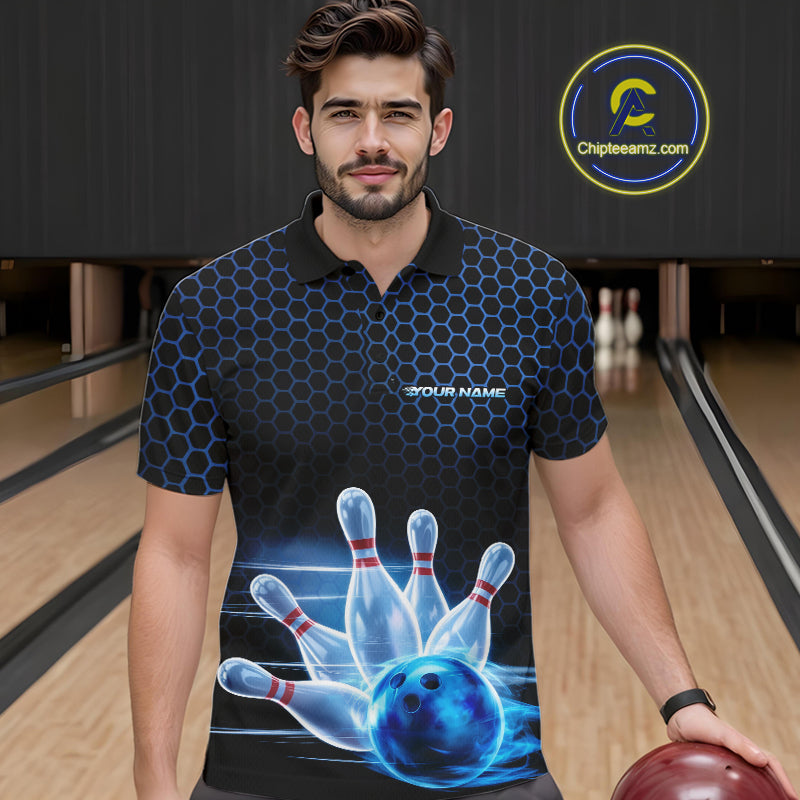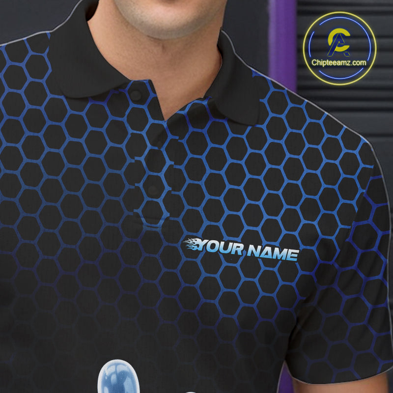 Custom Black And Blue Hexagon Flame Bowling Polo Shirts For Men, Bowling Team Shirt IPHW9389