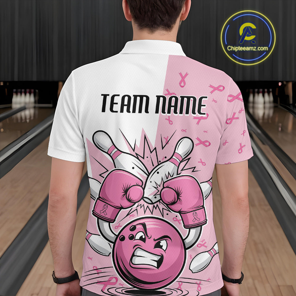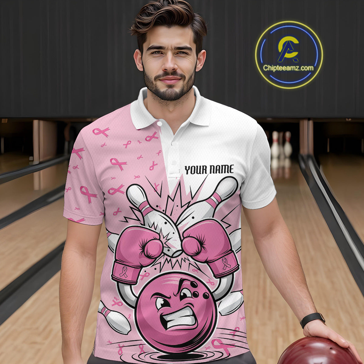 Custom Funny Pink Breast Cancer Bowling Men Polo Shirt, Breast Cancer Fighter Jerseys IPHW9394