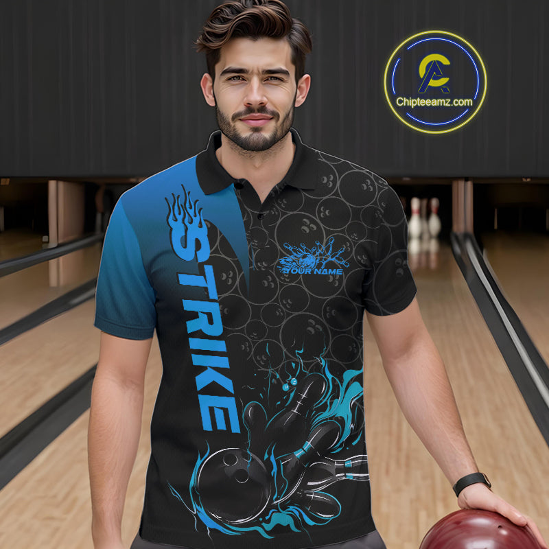 Custom Bowling Pattern Blue Flame Strike Bowling Team Men Polo Shirts, Bowling Jerseys IPHW9416