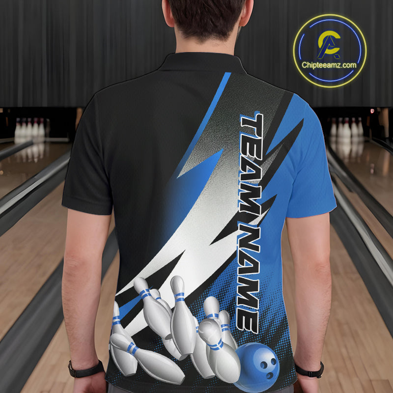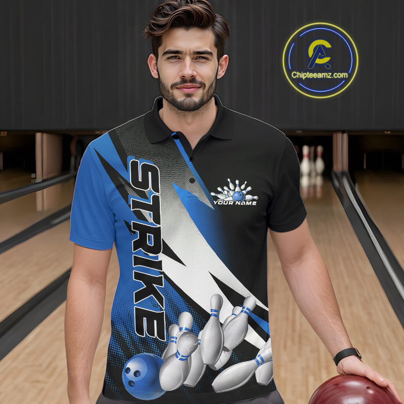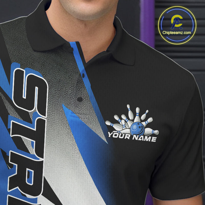 Custom Black And Blue Strike Bowling Polo Shirts For Men, Bowling Team Uniform IPHW9425