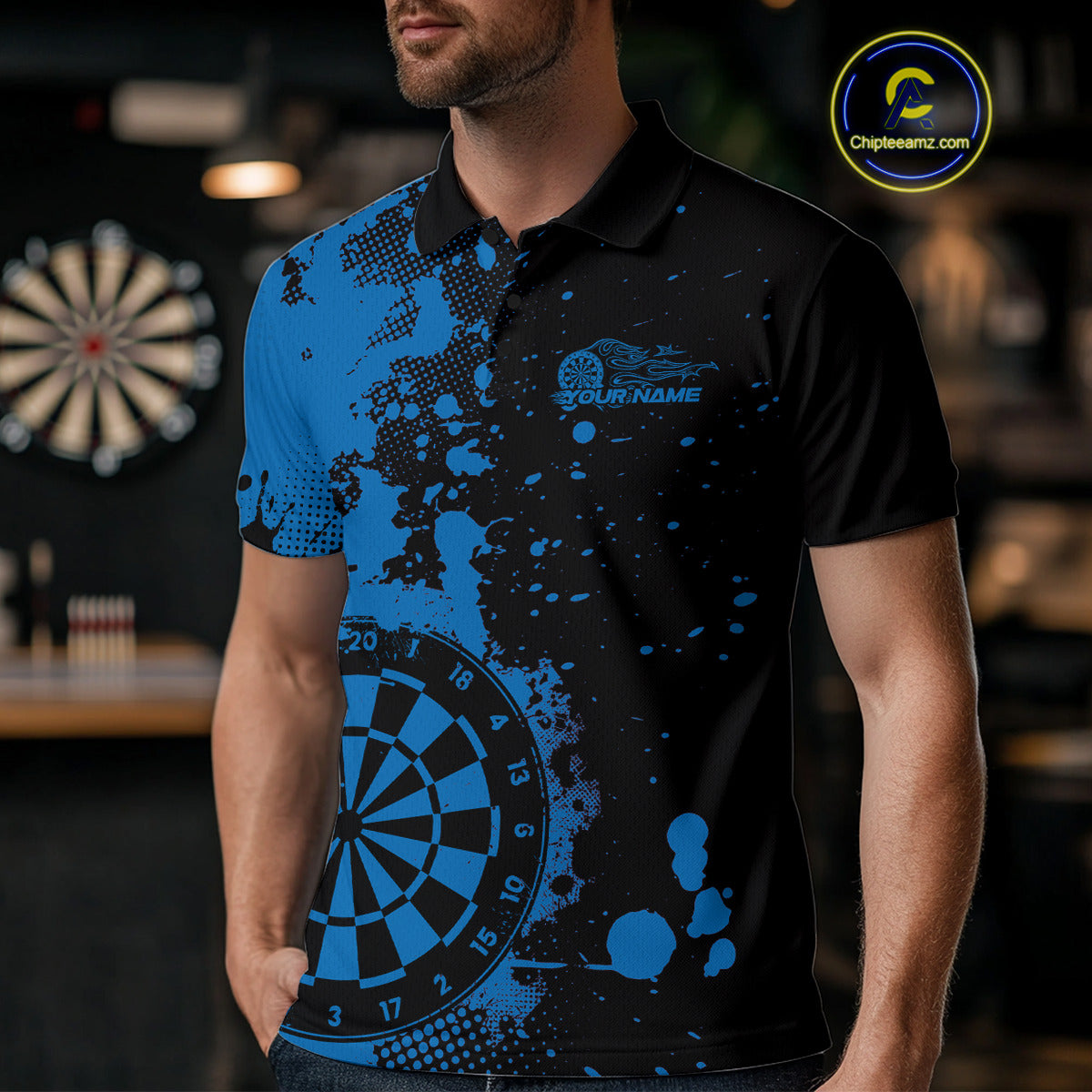 Custom Black And Blue Splatter Dartboard Dart Polo Shirt For Men, Grunge Dart Team Jerseys IPHW9958
