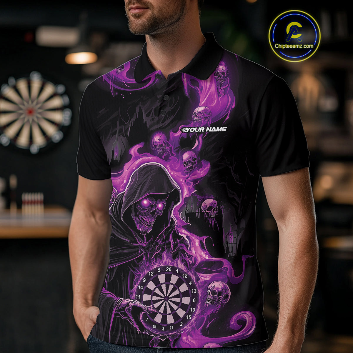 Custom Purple Pink Fire Flame Grim Reaper Dart Men Polo Shirts, Dart Team Halloween Outfits IPHW9985