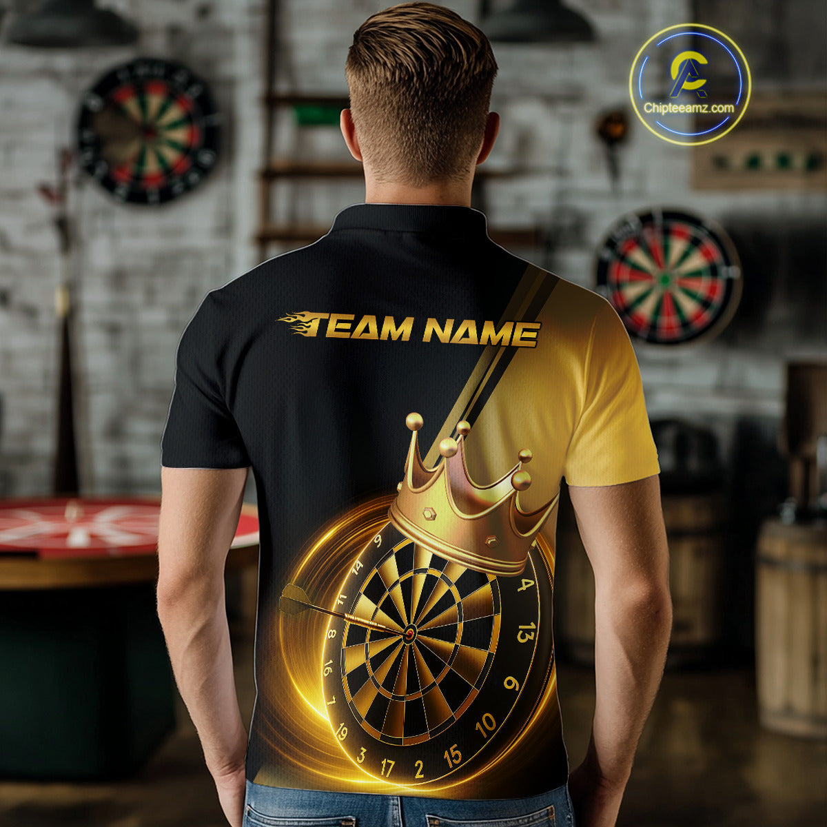 Custom Black And Gold Dartboard With Crown Dart Team Men Polo Shirts, Dart Jerseys IPHW9995