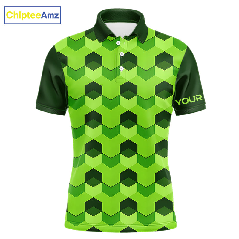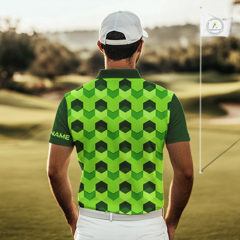 Plaid Mens Golf Polo Shirt Custom Abstract Green Hexagon Pattern Golf Shirts For Men NHN0156