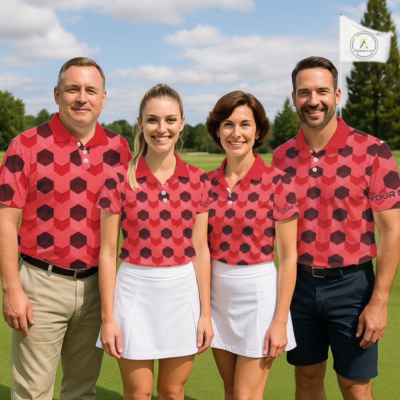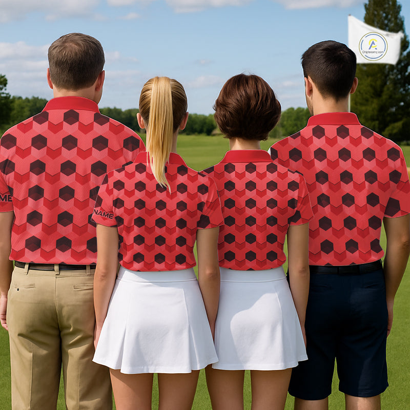 Plaid Mens Golf Polo Shirt Custom Abstract Red Hexagon Pattern Golf Shirts For Men NHN0156