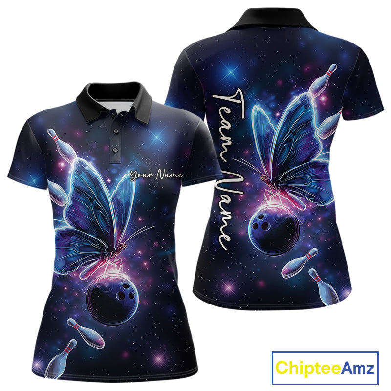 Custom Galaxy Butterfly Bowling Women Polo Shirts, Ladies Bowling Team Outfit IPHW10242