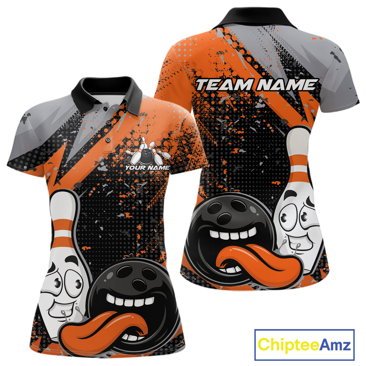 Custom Funny Bowling Polo Shirt For Women, Orange Bowling Ball And Pin Bowling Jersey IPHW10258