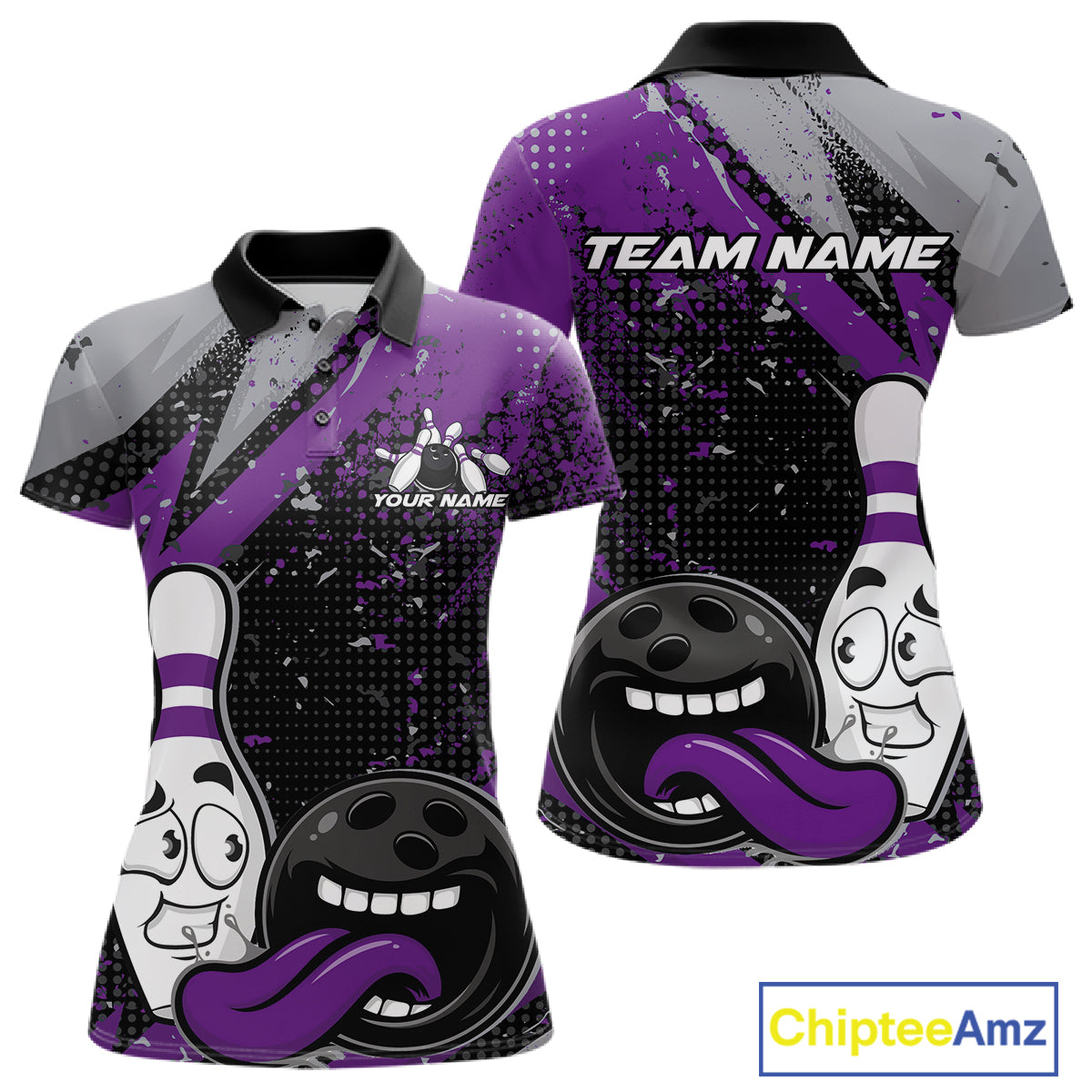 Custom Funny Bowling Polo Shirt For Women, Purple Bowling Ball And Pin Bowling Jersey IPHW10259