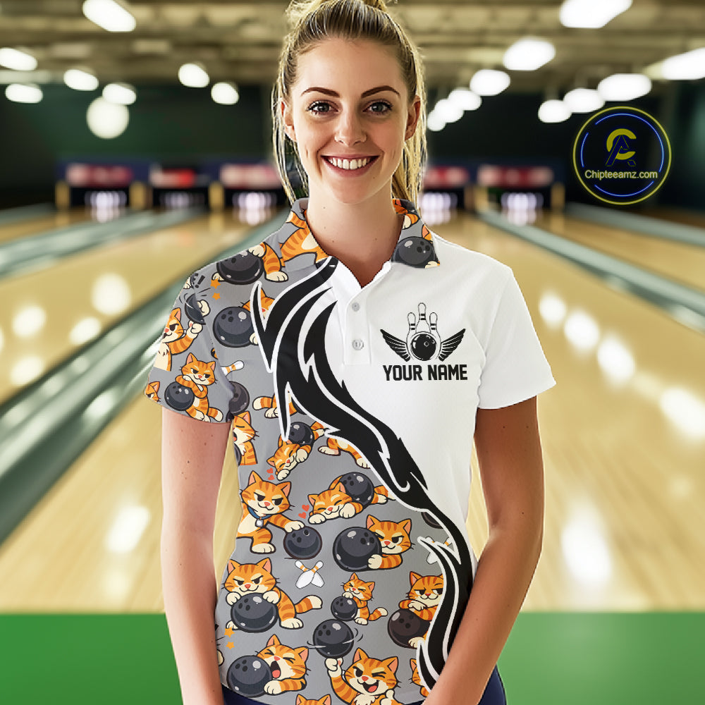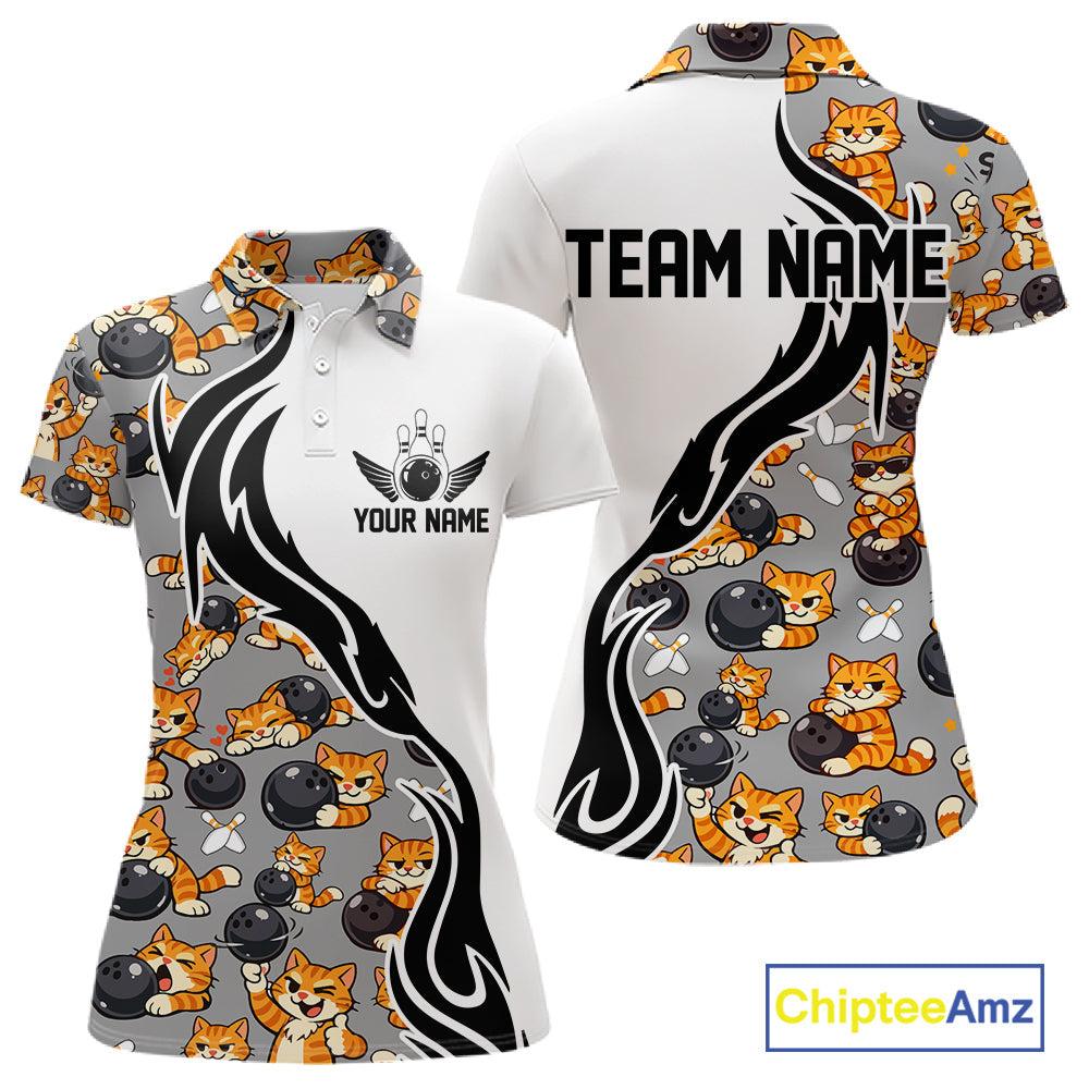 Custom Cute Funny Ginger Tabby Cat Bowling Women Polo Shirts, Cat Bowling Team Shirt IPHW10316