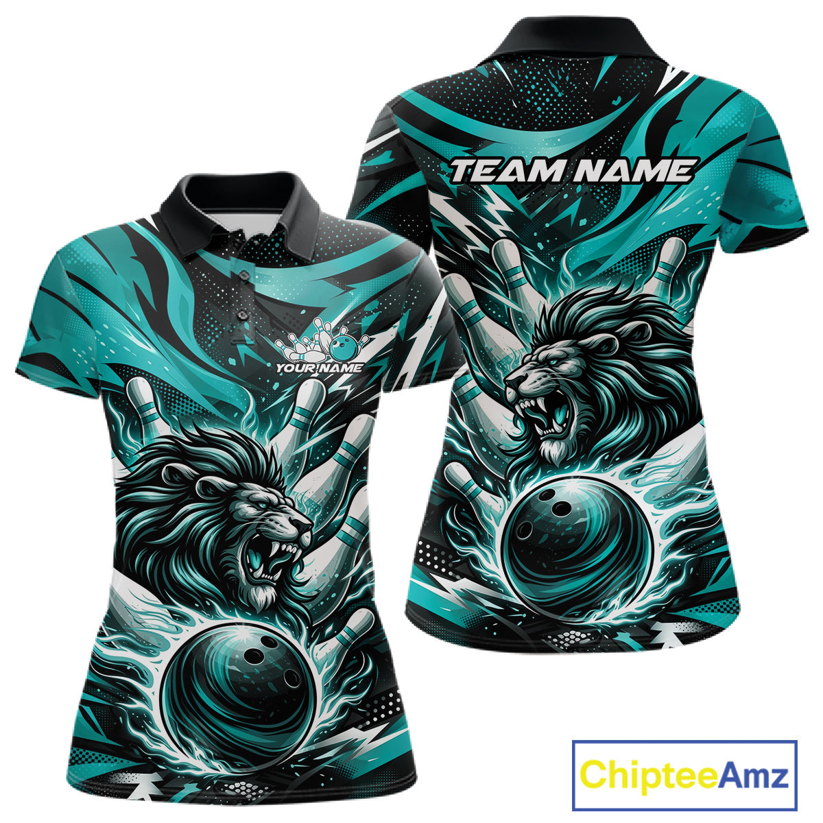 Custom Turquoise Blue Flame Bowling Ball Lion Bowling Jerseys, Lion Women Polo Bowling Shirt IPHW10350