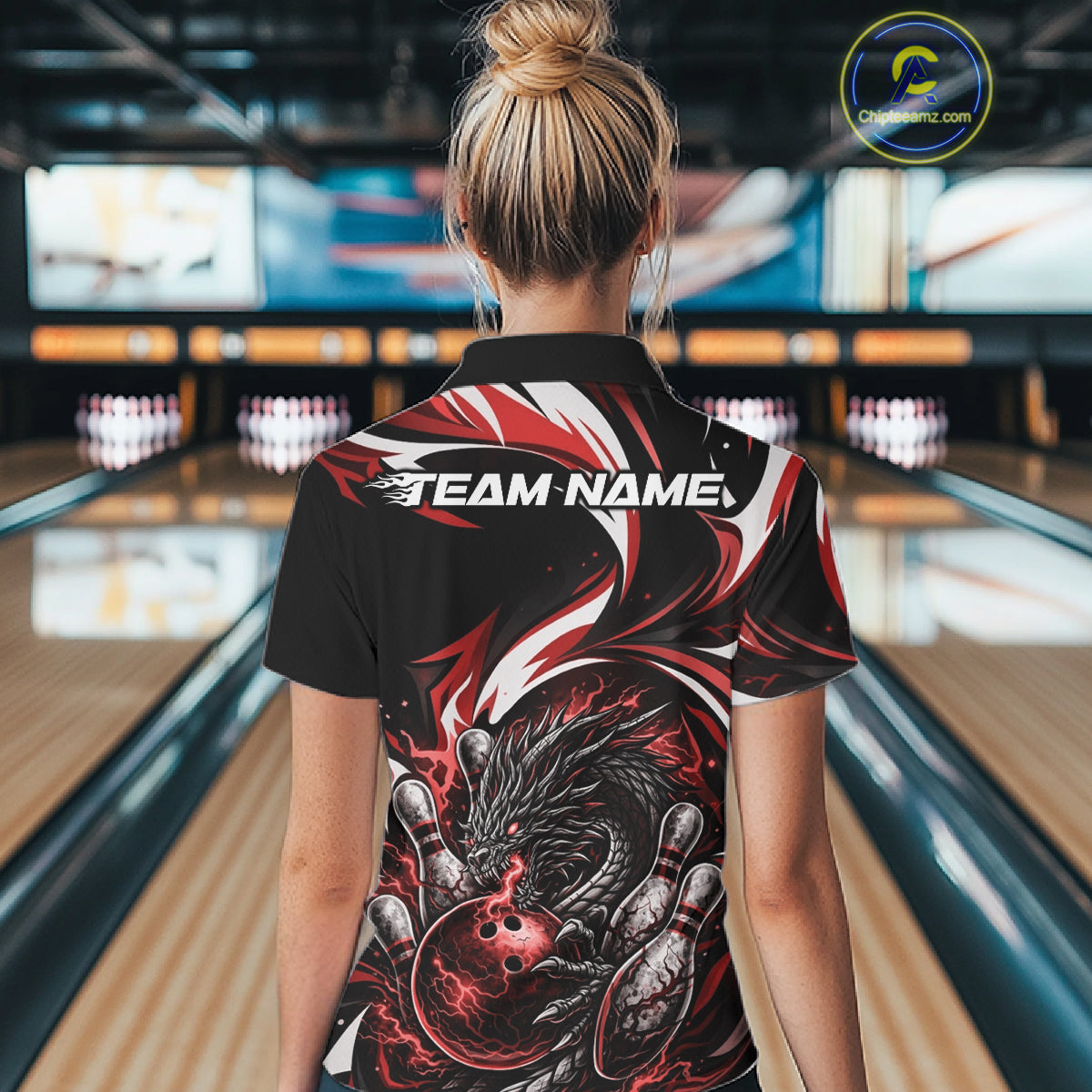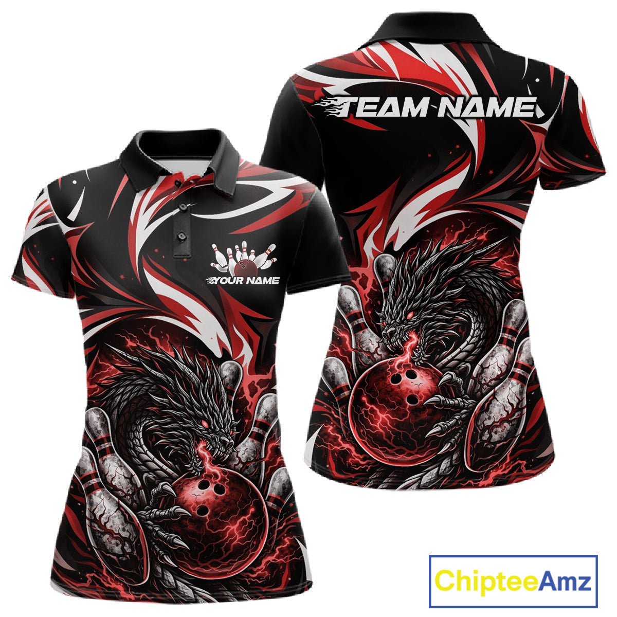 Custom Red Lightning Dragon Bowling Women Polo Shirts, Dragon Bowling League Shirt IPHW10356