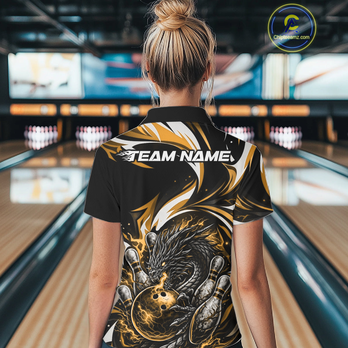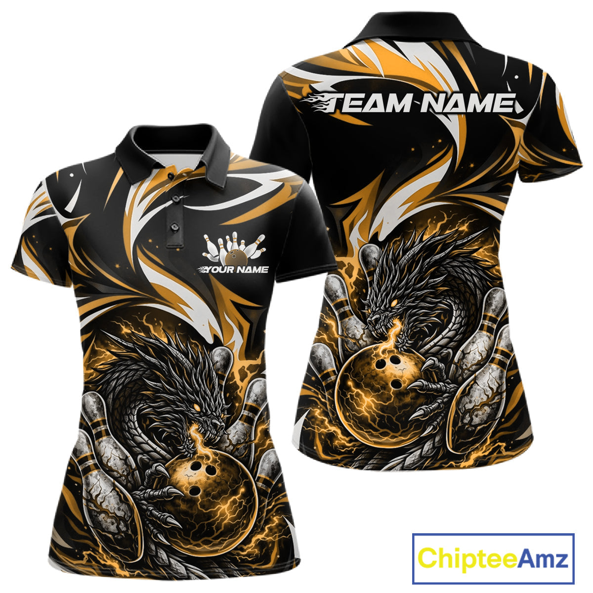 Custom Gold Lightning Dragon Bowling Women Polo Shirts, Dragon Bowling League Shirt IPHW10357