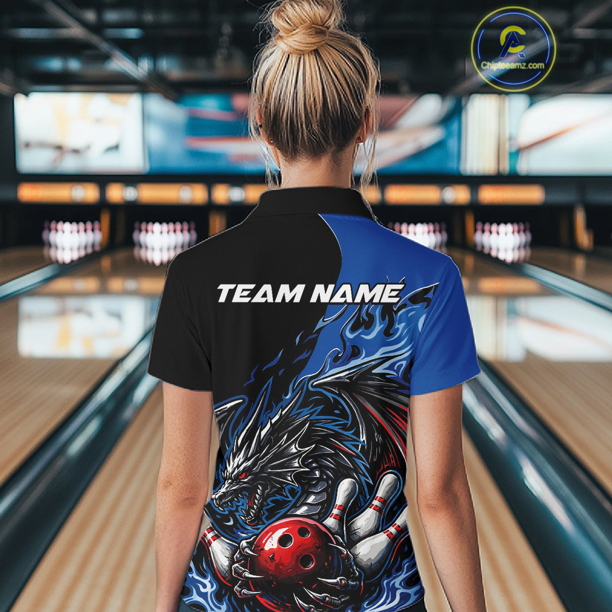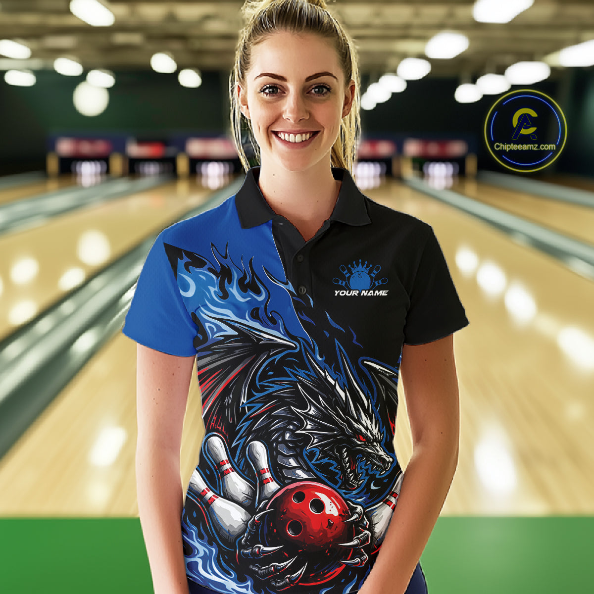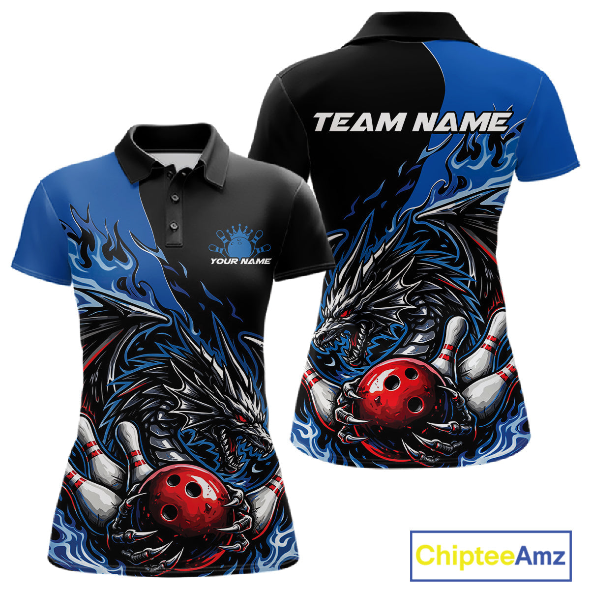Custom Blue And Red Dragon Bowling Women Polo Team Shirt, Dragon Bowling League Shirts IPHW10368