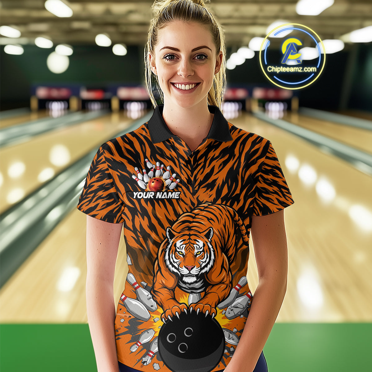 Custom Black And Orange Tiger Print Bowling Polo Team Shirts For Women, Bowling Jerseys IPHW9091