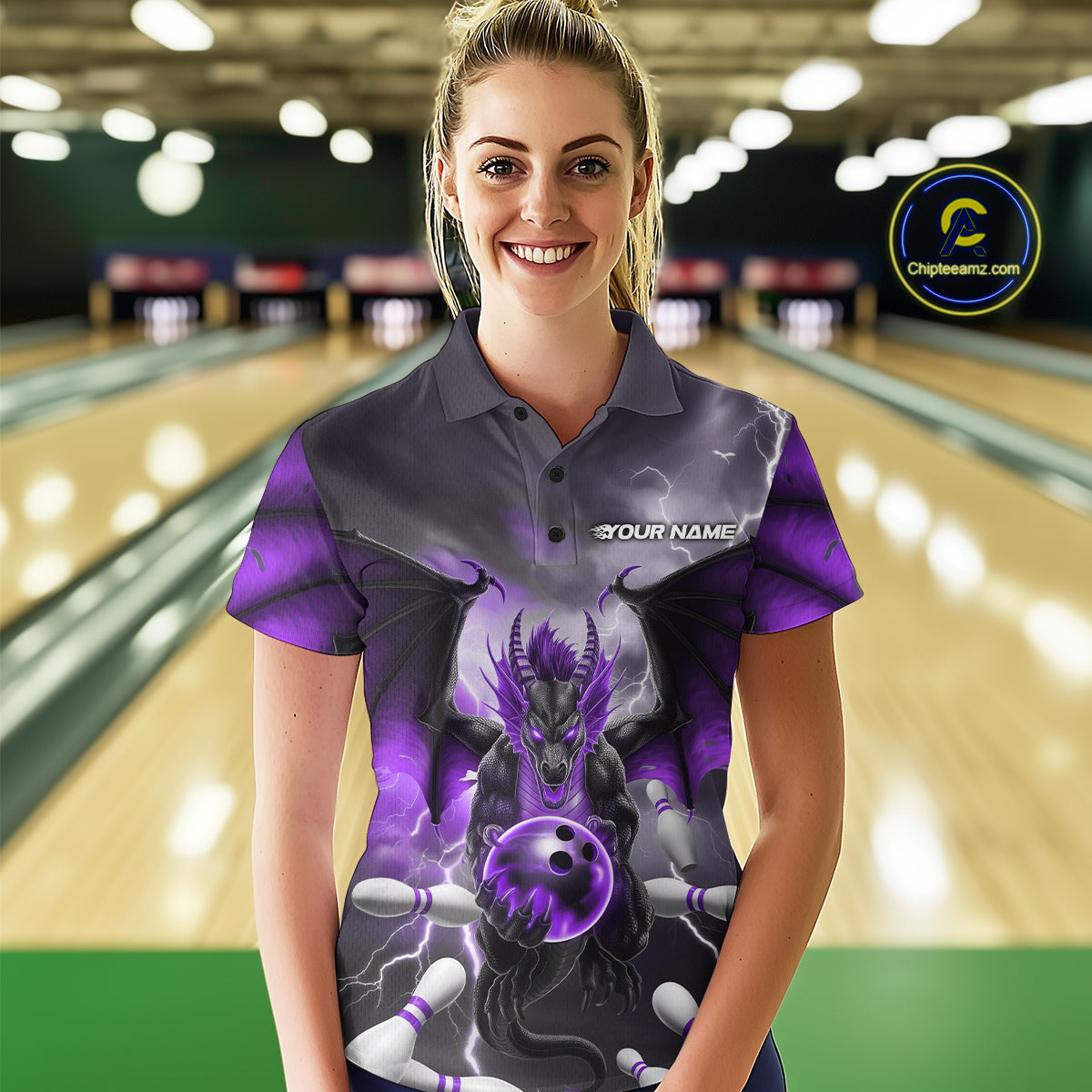Custom Purple Thunder Lightning Dragon Bowling Polo Shirts For Women, Team Uniform IPHW9104