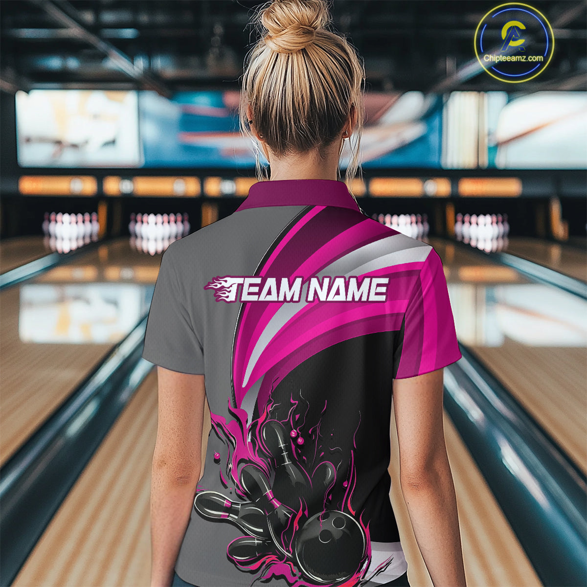 Custom Black, Pink And Gray Flame Bowling Polo Shirt For Women, Bowling Team League Shirt IPHW9275