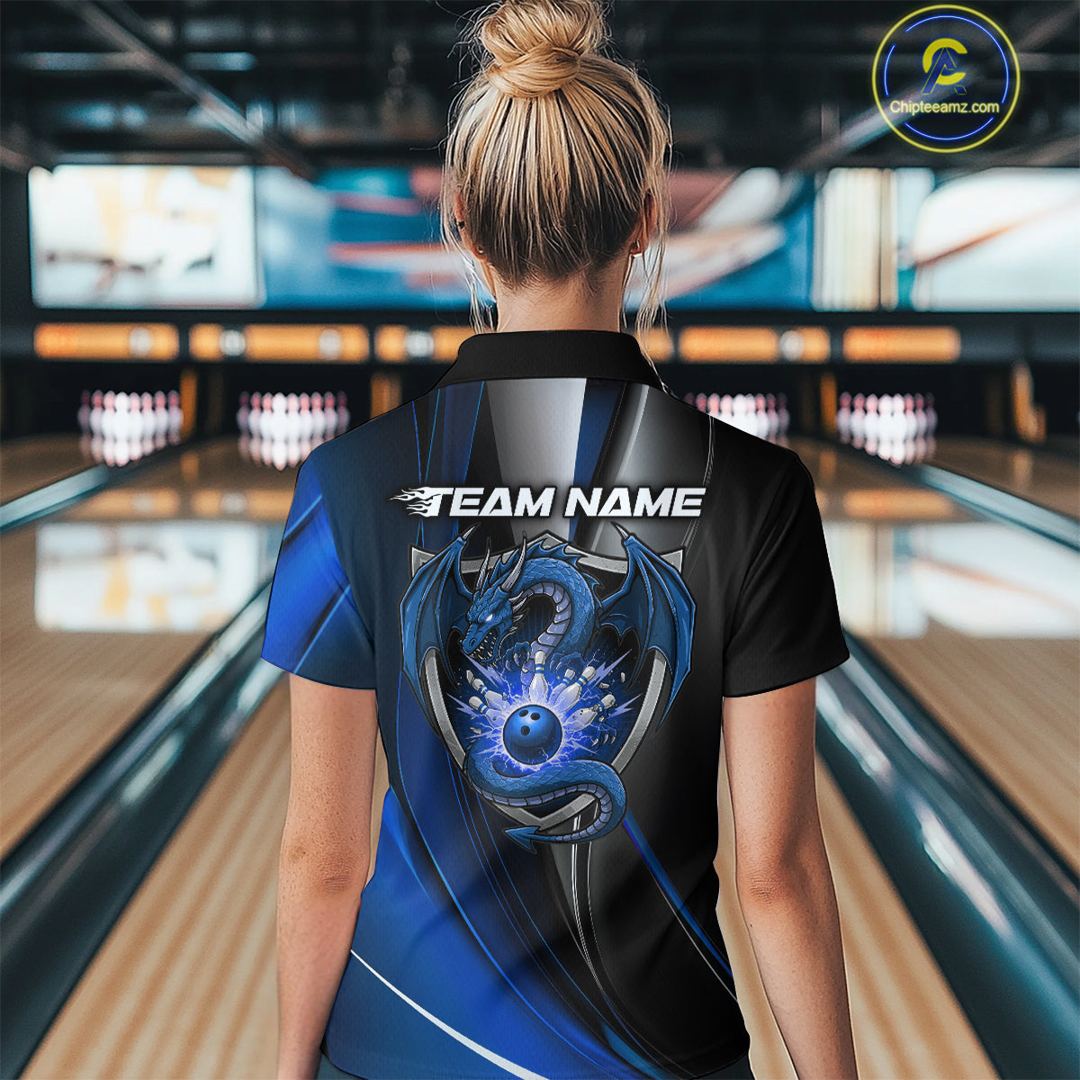 Custom Black And Blue Dragon Bowling Polo Shirts For Women, Dragon Bowling Jersey IPHW9343