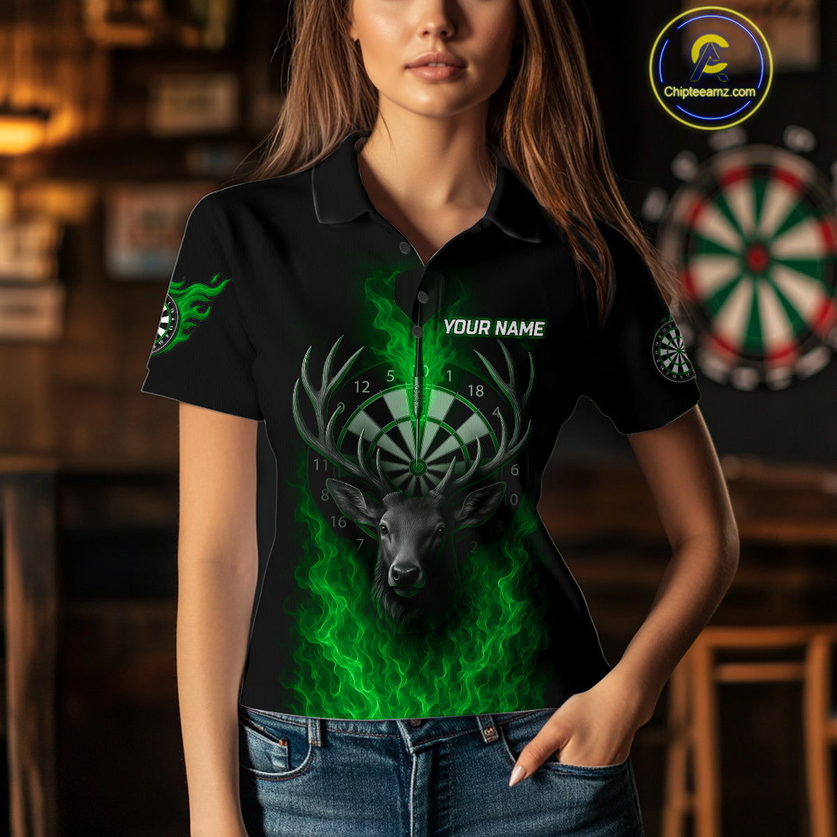 Custom Green Flames Dartboard Deer Funny Dart Women Polo Shirt Dart Team Jerseys NYN1634