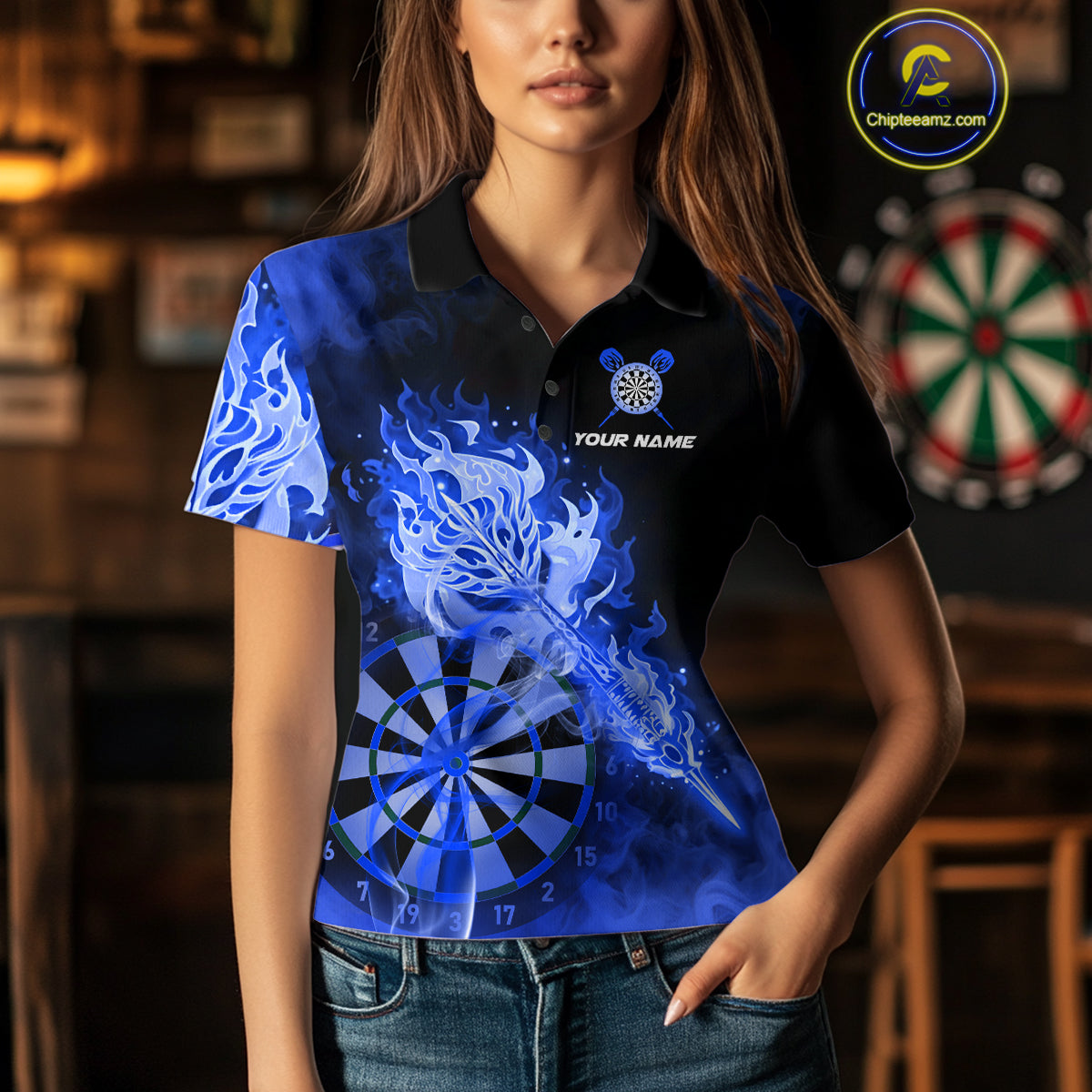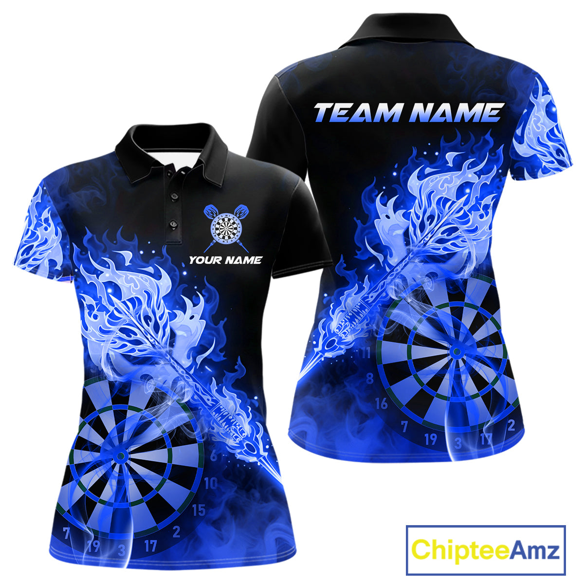 Custom Smoke Blue Fire Flaming Dart Arrow Women Darts Polo League Shirts Dart Team Jerseys NYN2215