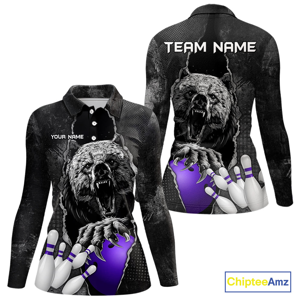 Purple and Black Bear grunge Custom Women Bowling Polo, 1/4 Zip Shirts Bowling Team Jerseys Outfits NQS10167