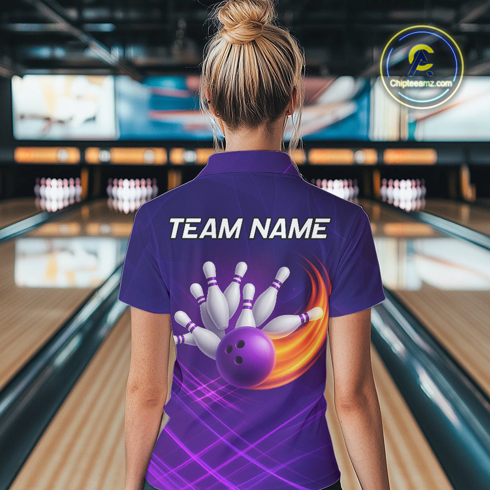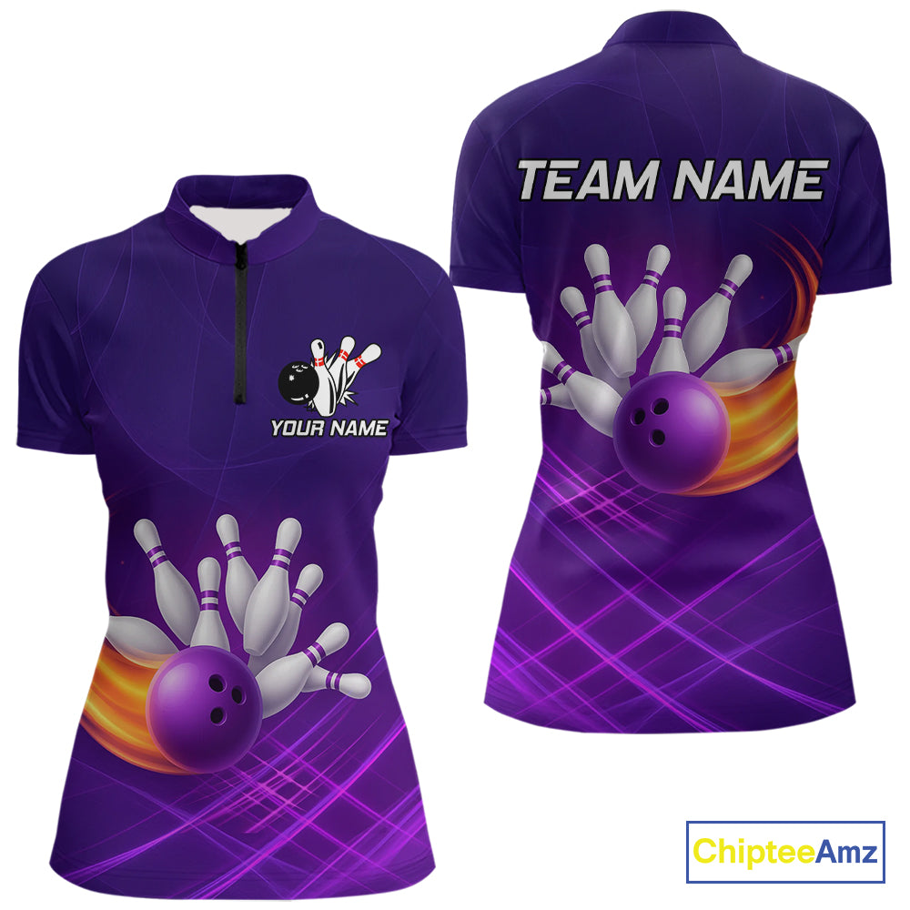 Purple Flame Bowling Polo, Quarter Zip Shirts For Women Custom Team Bowling Jersey Uniform NQS10768