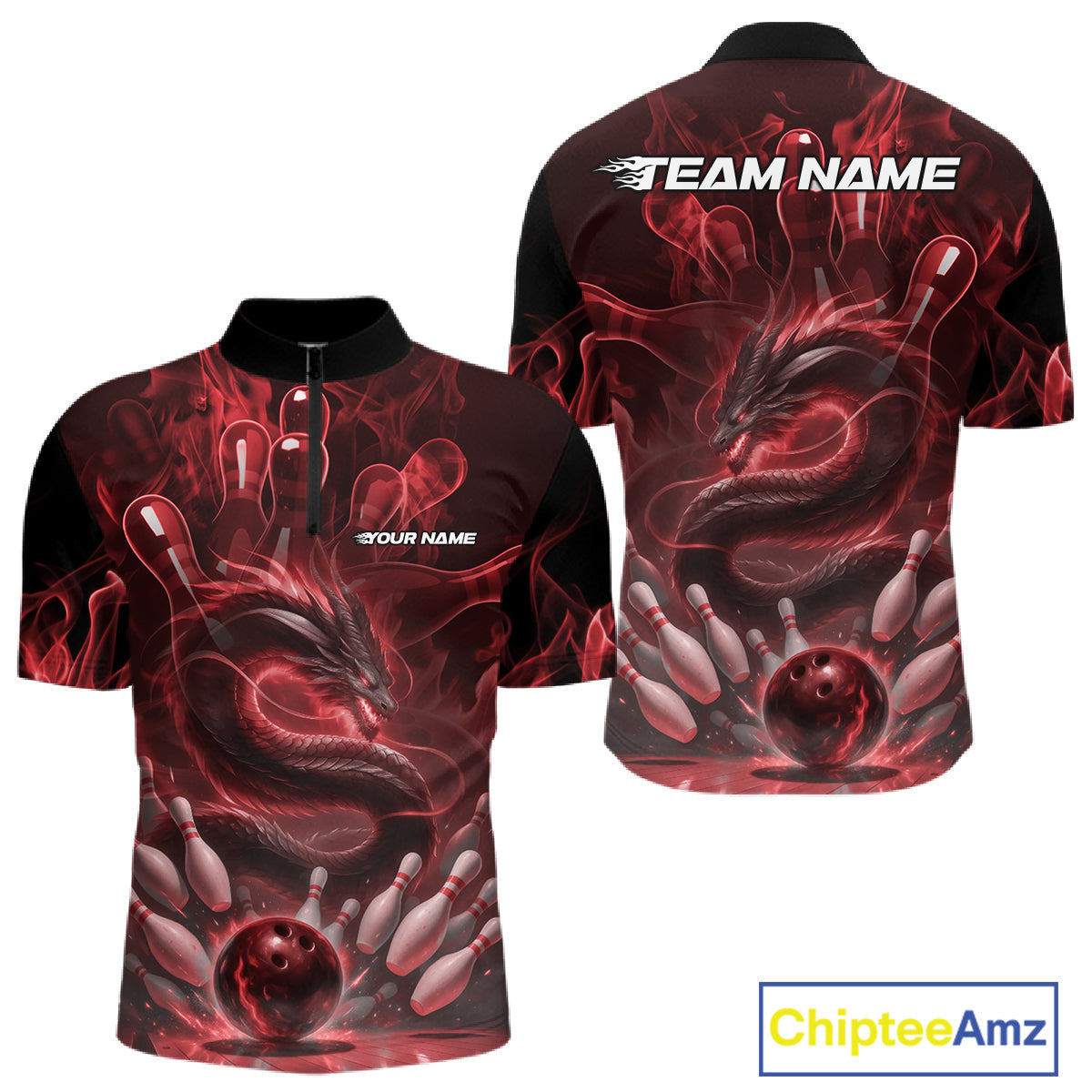 Custom Red Flame Dragon Bowling Men Quarter-Zip Shirts, Dragon Bowling League Shirt IPHW10226